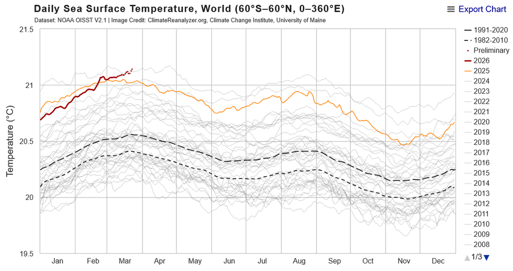 Daily oisst has moved into record territory, continuing to track 2023; but 0.1 - 0.2C warmer. It is likely that SST will continue to set daily records until the developing nino fades sometime in 2027.