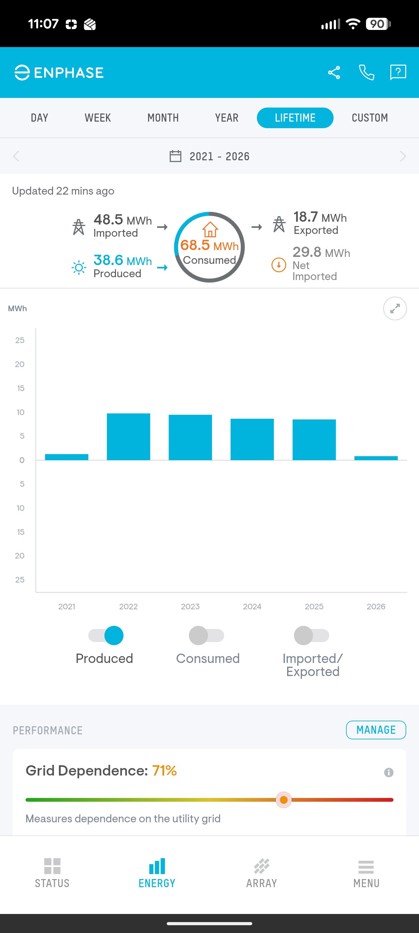 Very interesting. I didn't think to look at the system output for our rooftop in DC. Either the weather is getting shittier every year since 2022, the sun is dying, or my panels are aging.