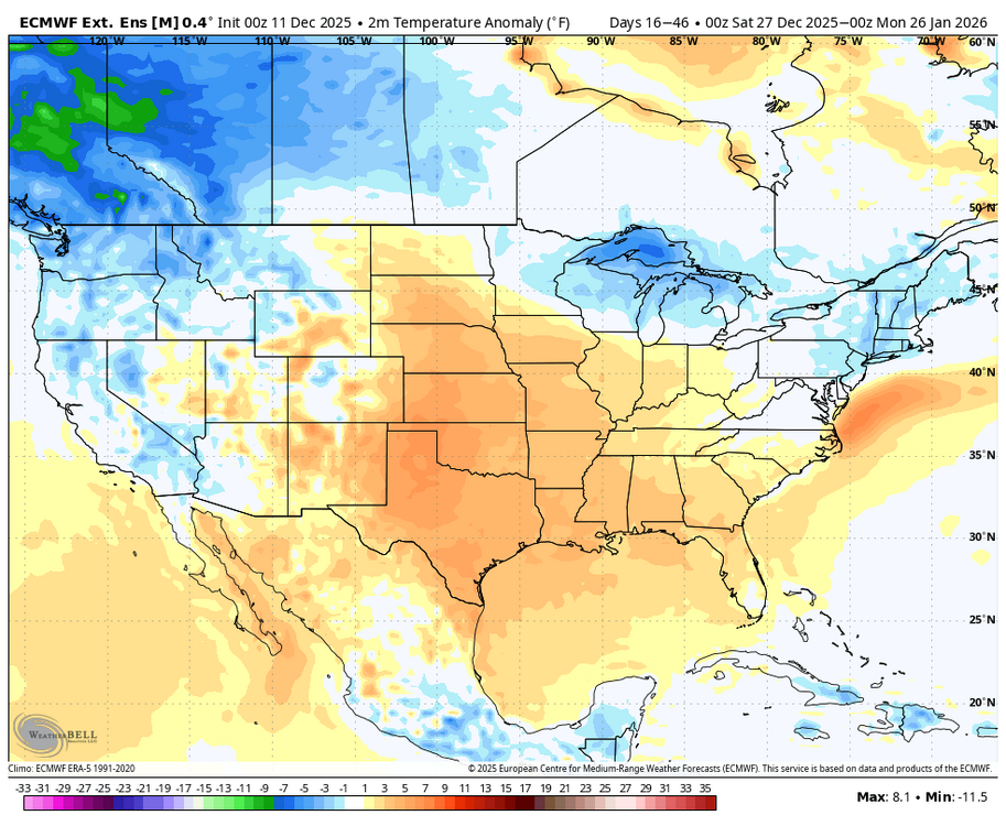 The 30 day temperature anomaly on today’s Euro Weeklies is near normal for the period from late December into late January for this region. Hopefully we have chances for Winter storms with near normal being good enough in January. -
