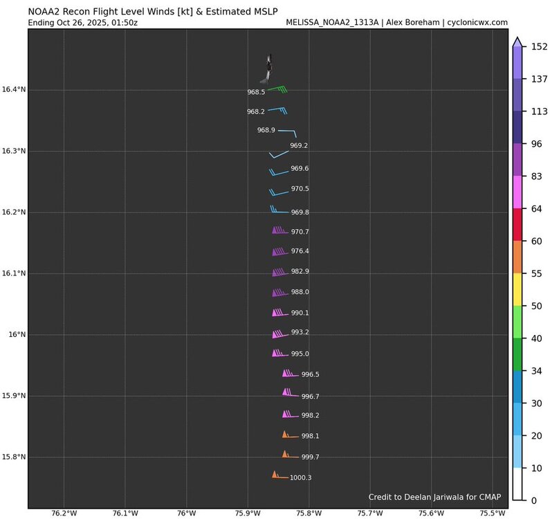 Unfortunately, with atmospheric conditions progressively becoming more favorable with each passing hour, I do not see a scenario where Melissa does not efficiently achieve its MPI. Land interaction or internal structural changes are the only limiting factors until it's picked up by the trough in a few days.