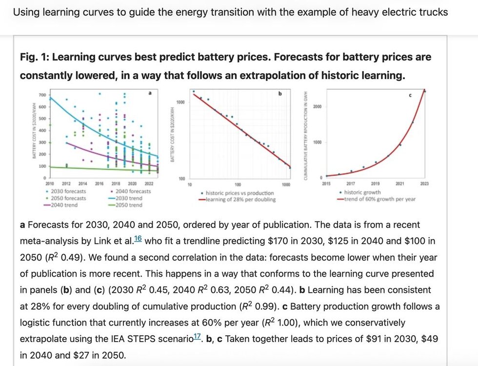 Battery costs are declining along well established cost curves. This ongoing cost decline is hammering the competitiveness of fossil fuels. Cheap batteries mean solar and wind are no longer intermittent energy sources and transportation is readily electrified. This article shows how electric trucks will quickly become more cost-effective than diesel. This is being driven by China which has recognized the long-term business opportunity. They will use this gear to reduce fossil fuel imports and sell increasing amounts to the rest of the world. Meanwhile our leadership is in denial. Doubling down on outmoded energy technology. https://www.nature.com/articles/s44333-025-00029-5.pdf