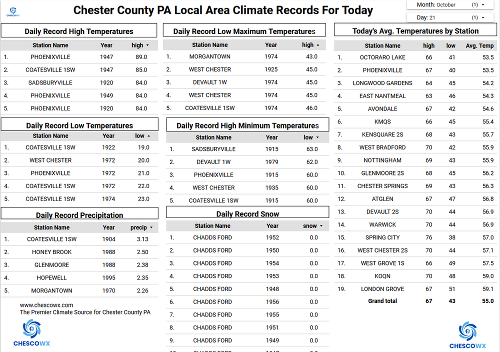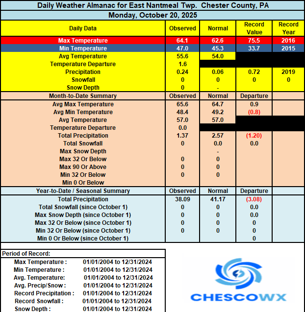 Lows this morning ranged from as low as 33.6 in valley locations like Warwick Township to 46.8 at ridge locations like West Grove, Today we should we our warmest day of the week with some valley locations nearing 70 degrees. Higher ridge locations will remain in the upper 60's. A cold front crosses the area overnight tonight with some very light showers. After that we seem temperatures no higher than the 50's for highs and 30's for lows through the rest of the week and into the weekend. For those lower elevation spots that have already had multiple freezes this month you could see a couple more both Thursday and Friday morning. Higher ridge spots look to continue their growing season with lows remaining above freezing through the week. -