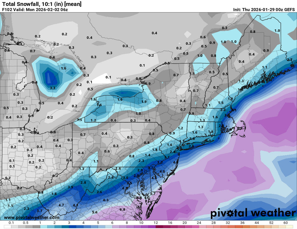Very minor tick west on GEFS Snowmap but overall virtually unchanged from 12z -