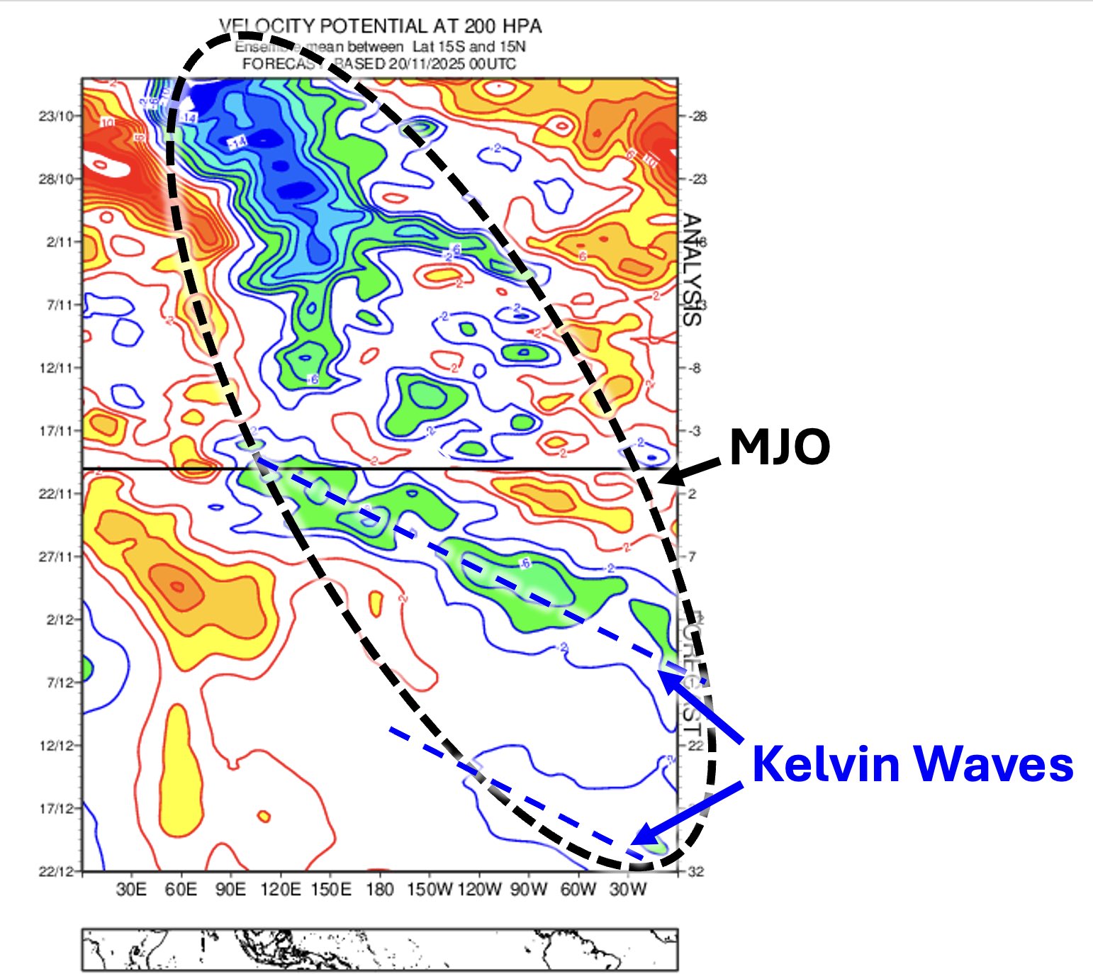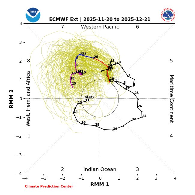 Eric Webb @webberweather It’s easy to spot Convectively Coupled Kelvin waves (blue dashed lines) propagating quickly thru the mjo envelope (black dashed line) the next few weeks on the forecast VP200a Hovmöller (left) This is largely why you’re seeing these loop-de-loops on the RMM phase plots (right)