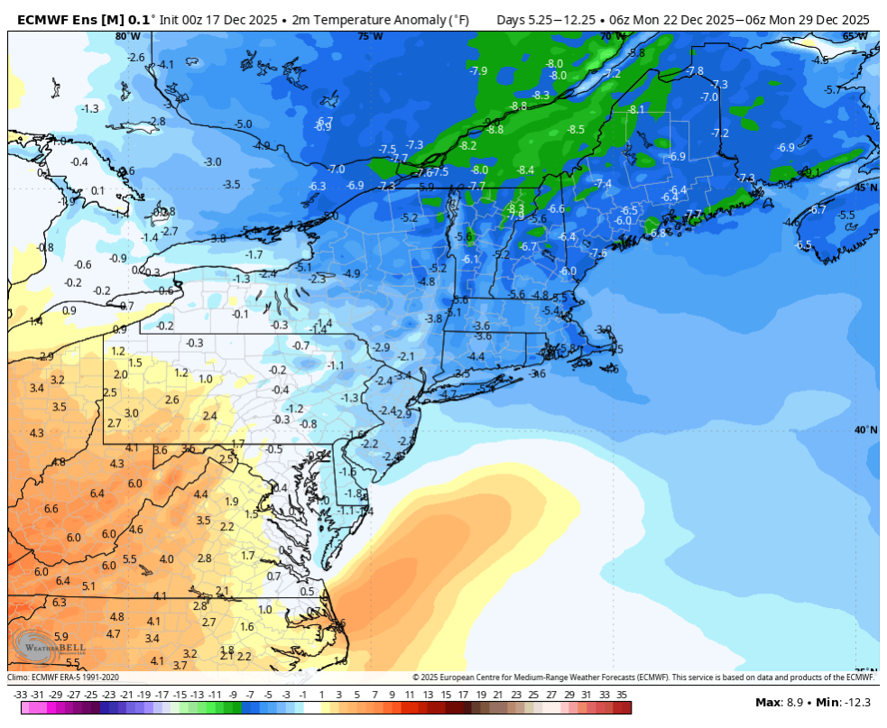 Not backing off much at all really. The difference between a -3 to -4 from 2 to -3 in a long range forecast is pretty much statistical noise. The EPS is around a 0 to +1 the rest of the month. So that would yield a 7 station average of around -3 to -4 from the current -7.7. Long Island is running a little warmer and is only -5.5 at ISP through the 16th.