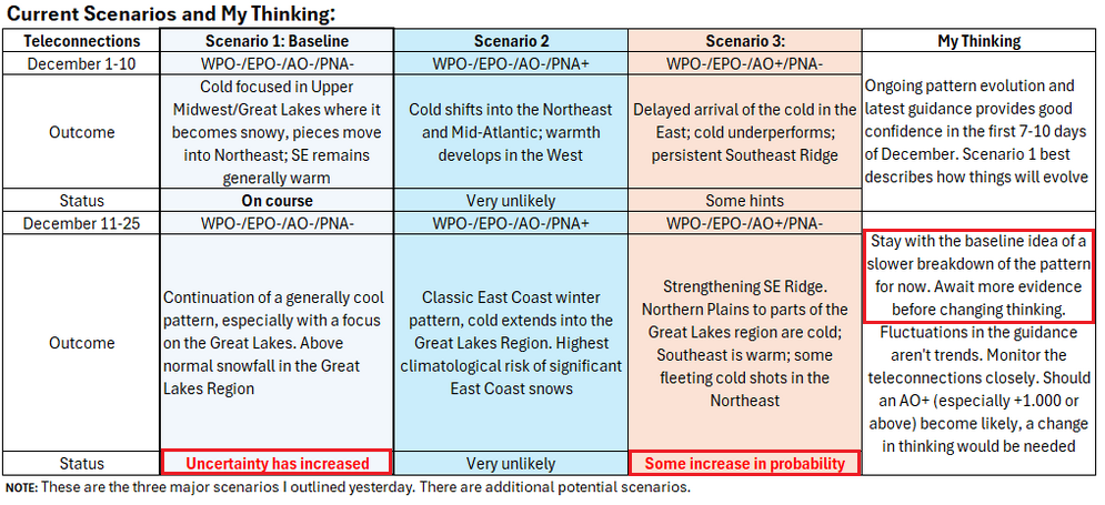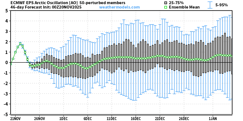 Several things: 1) There remains a lot of uncertainty how the stratospheric warming will propagate. Propagation could be a big factor in prolonging/strengthening or bringing back Atlantic blocking. 2) Even as stratospheric warming often (not always) propagates favorably to build or prolong/strengthen Atlantic blocking, one should not immediately dismiss hints of evidence to the contrary. Confirmation bias is bad for forecasting. Such evidence exists e.g., here's the AO forecast from the EPS 46-day forecast: A systematic forecasting framework allows one to acknowledge such evidence while avoiding rash decisions from model noise. As I don't have a crystal ball to have 100% confidence in whether or not the above AO forecast will verify, I have made a note to continue to monitor developments. Needless to say, there is more to it than such a framework. Each scenario has clusters of outcomes (not discussed above). It should be noted that such frameworks don't guarantee accuracy, but they do reduce the risks that can otherwise lead to bad forecasts, especially when one is dealing with timeframes over which model skill is limited or worse. -