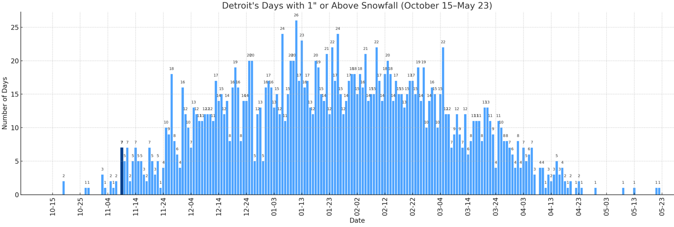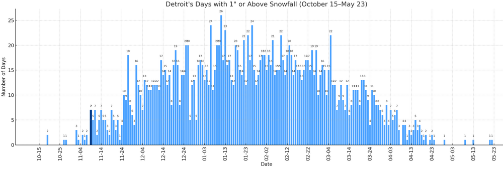 With 1.2" of snow earlier today, Detroit saw 1" or more snowfall for the 7th time on record for November 9. The prior cases for November 9 snowfall of 1" or above are: 1894 2.0" 1913 1.8" 1921 5.3" (daily record; 3rd biggest daily snowfall on record prior to November 15; 8th biggest daily snowfall on record for November) 1933 1.3" 1971 1.6" 2018 1.3" November 9 is the earliest date with 7 or more such snowfalls. -