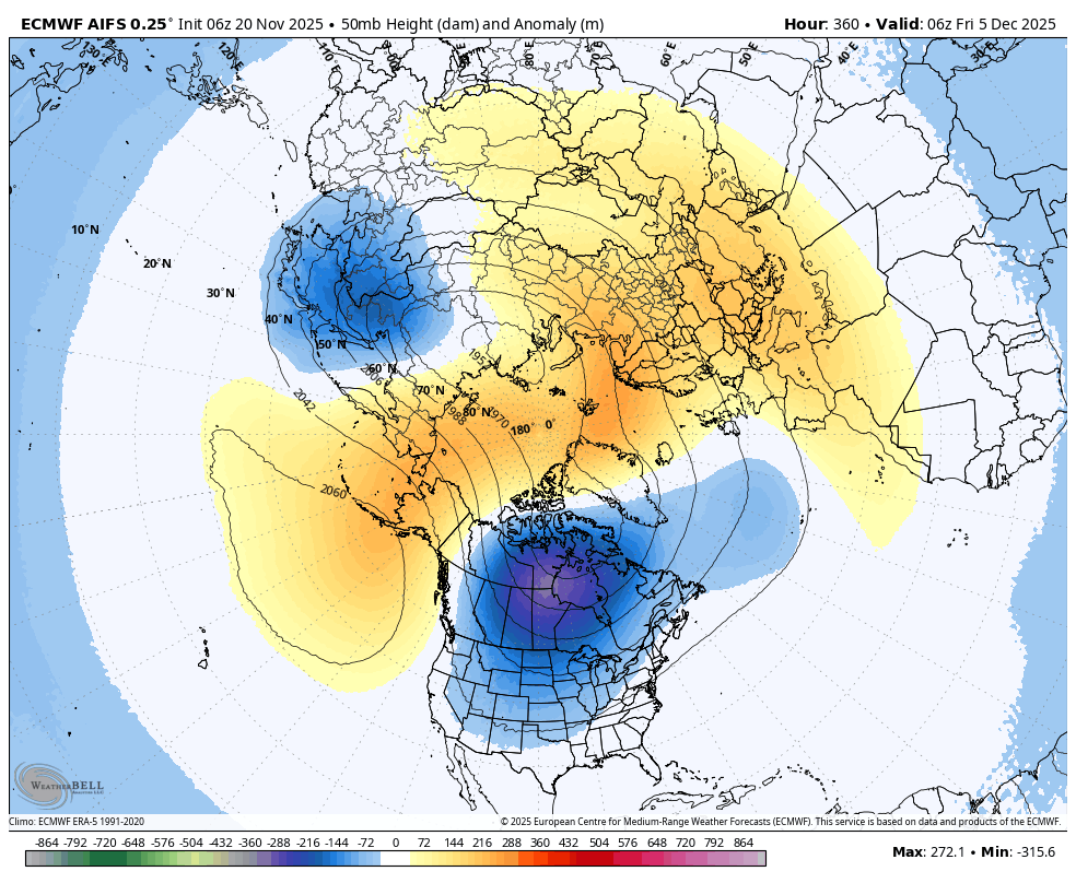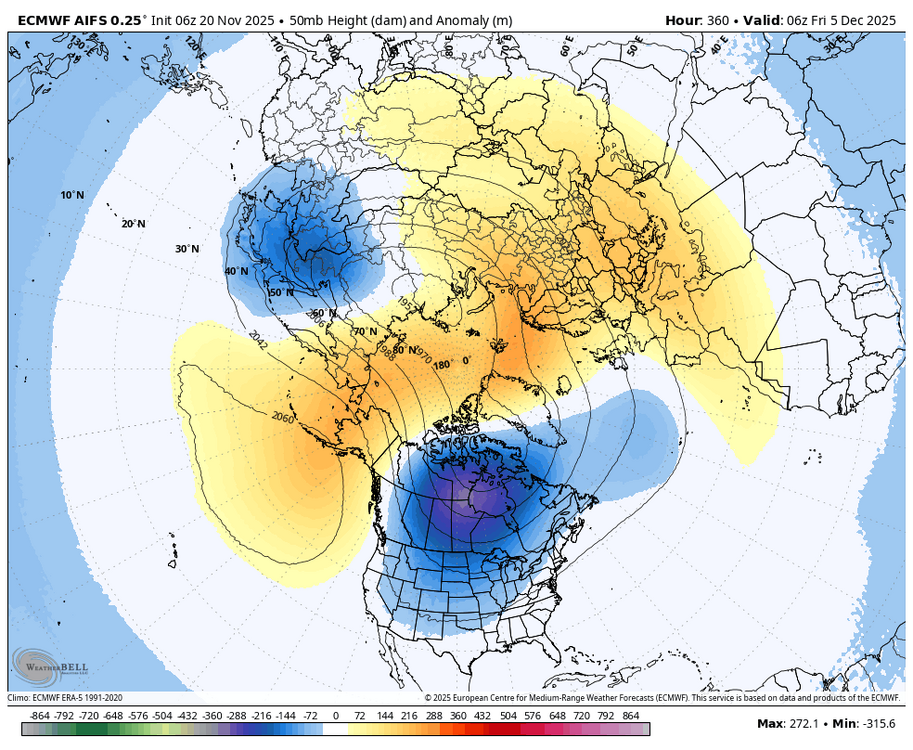 Some guidance wants to bring one of the PV lobes into North America. The 06Z AIFS does this near the end of its run, and unsurprisingly is building some very cold air at the surface at this same time. Obviously that is what we would want to see heading into December.