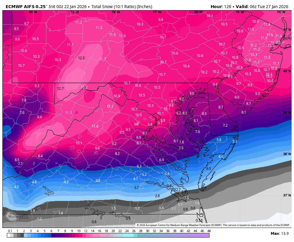 This storm takes on extra importance due to the prolonged cold after the event. Even though we want 1+ foot storms as often as possible, when it's going to be 46, 48, and 52 in the 3 days following, I am never super excited. This one is a potential dream!! -