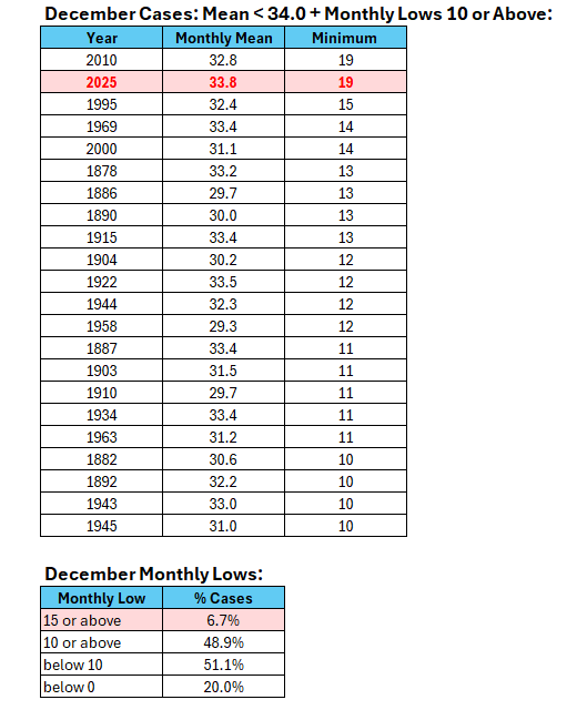December 2025 tied Central Park's record for the highest monthly minimum temperature for any December with a monthly mean temperature below 34.0°. Fun fact: 15/21 (71%) of those cases prior to 2025 had seasonal snowfall of 30" or more, including 9/21 (43%) with 40" or more. Just 1/21 (5%) had less than 20" seasonal snowfall (1958-59 with 13.0").