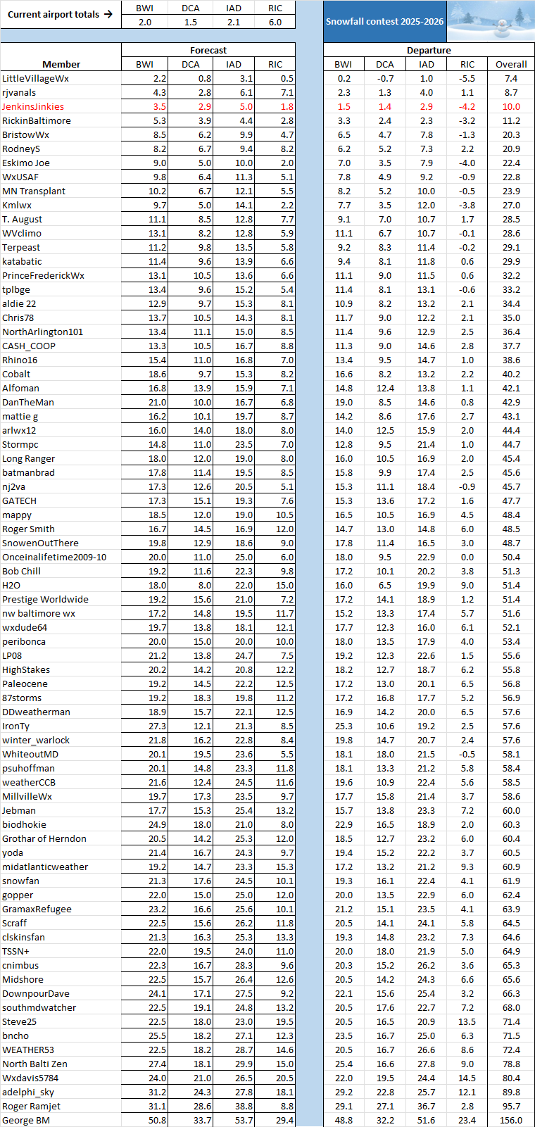 Dulles received 0.1 inch of snow this morning, and so here is the updated table, which shows a decreased departure for all entrants of 0.1.