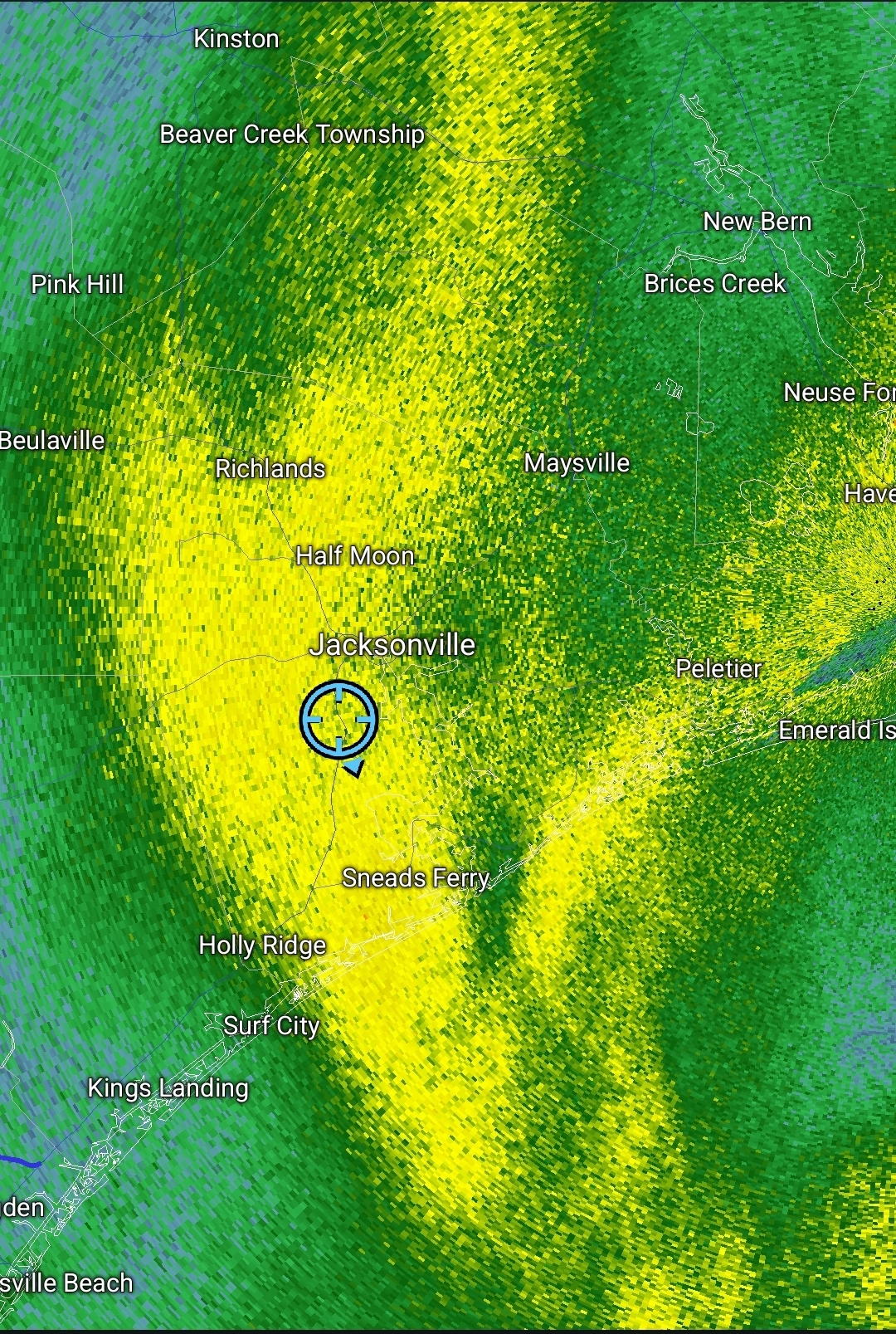 Whopper of a deformation band setting up from Jacksonville to Greenville in E NC right now as the low rapidly deepens with the trough going negatively tilt. Have to think 20"+ or perhaps even two feet is on the table for some. -