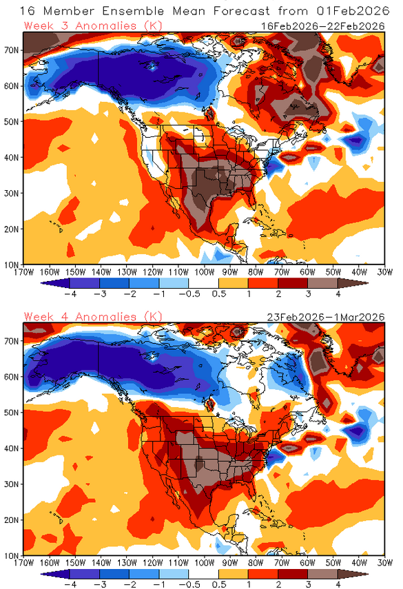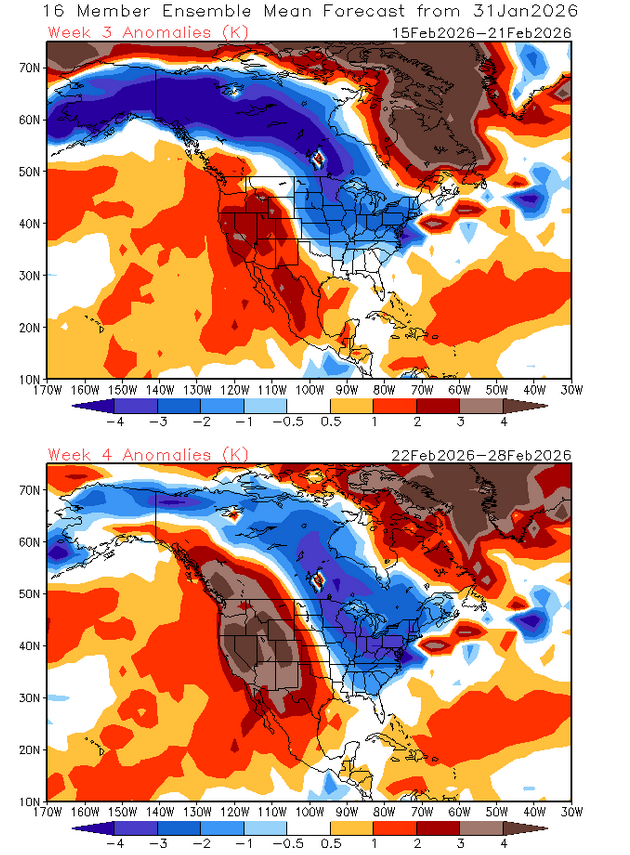 The NG market seems to be surfing the CFSv2's long-range outlook. From January 31: From February 1: The moderation starting around the 10th is real. The consistent theme is that the southern and central plains/West will remain generally warmer than normal but there could be a 7-10-day cooler period in the West. Wave lengths will be shortening beyond mid-month, complicating things and enhancing the level of uncertainty. I don't think either a mild or cold outcome in the East beyond let's say February 20th is a slam dunk. I'd still give greater weight to the ECMWF weeklies for a possible return of cooler weather, not necessarily severely cold weather, as there are some hints that the EPO and WPO could go negative sometime after mid-month. -