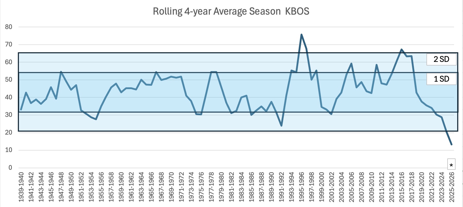 I'm in awe of the absolute clinic (interference and otherwise) by which SNE is missing significant snowfall, especially now in a BN cold stretch... For 15-16th and 18-19th in particular, strength of the vort on guidance a few days ago seemed like it would overcome any inteference issues to at least graze (15-16th) or cut (18-19th) A corollary: there are many more routes to having no event than there are for an event to materialize. I did this last year and was curious how it extrapolates this year... I charted 4-year rolling average snowfall at KBOS. Obviously 2025-2026 is not over, so for February and March I just used historic means (* indicates extrapolation from historic means for those 2 months). Look how off the charts this 4 year stretch has been... well below 2 standard deviations: -