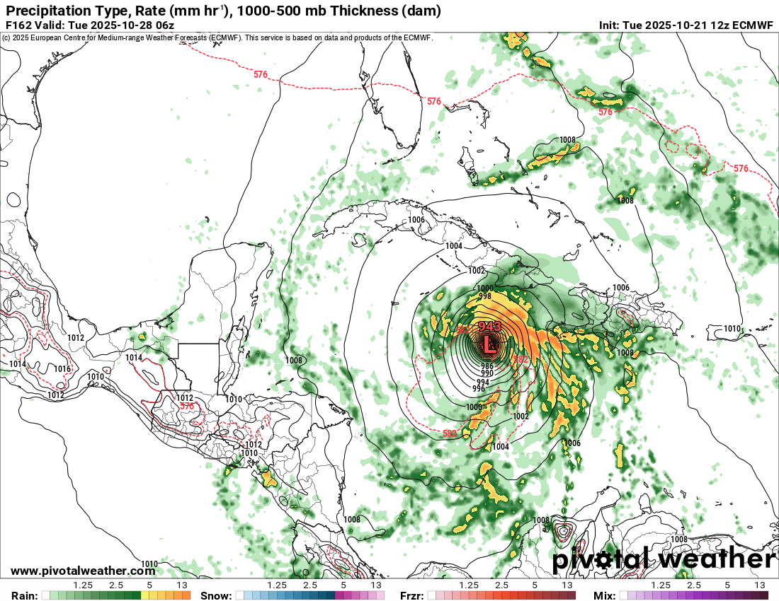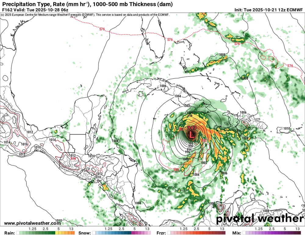 12Z -GFS (Hisp.), CMC (C Cuba), Icon (weaker than recent runs but still E of Jamaica to Jamaica) and UKMET (Nic/Honduras border) are pretty similar to recent runs. UK: TROPICAL STORM MELISSA ANALYSED POSITION : 14.7N 70.8W ATCF IDENTIFIER : AL132025 LEAD CENTRAL MAXIMUM WIND VERIFYING TIME TIME POSITION PRESSURE (MB) SPEED (KNOTS) -------------- ---- -------- ------------- ------------- 1200UTC 21.10.2025 0 14.7N 70.8W 1007 36 0000UTC 22.10.2025 12 14.7N 73.1W 1005 33 1200UTC 22.10.2025 24 15.0N 74.3W 1005 36 0000UTC 23.10.2025 36 15.5N 75.0W 1004 35 1200UTC 23.10.2025 48 16.1N 76.4W 1005 35 0000UTC 24.10.2025 60 16.4N 76.4W 1005 27 1200UTC 24.10.2025 72 16.6N 76.7W 1005 30 0000UTC 25.10.2025 84 16.4N 78.0W 1005 27 1200UTC 25.10.2025 96 15.7N 79.7W 1006 25 0000UTC 26.10.2025 108 15.1N 81.5W 1005 23 1200UTC 26.10.2025 120 15.0N 82.8W 1005 24 0000UTC 27.10.2025 132 15.5N 84.0W 1006 22 1200UTC 27.10.2025 144 CEASED TRACKING