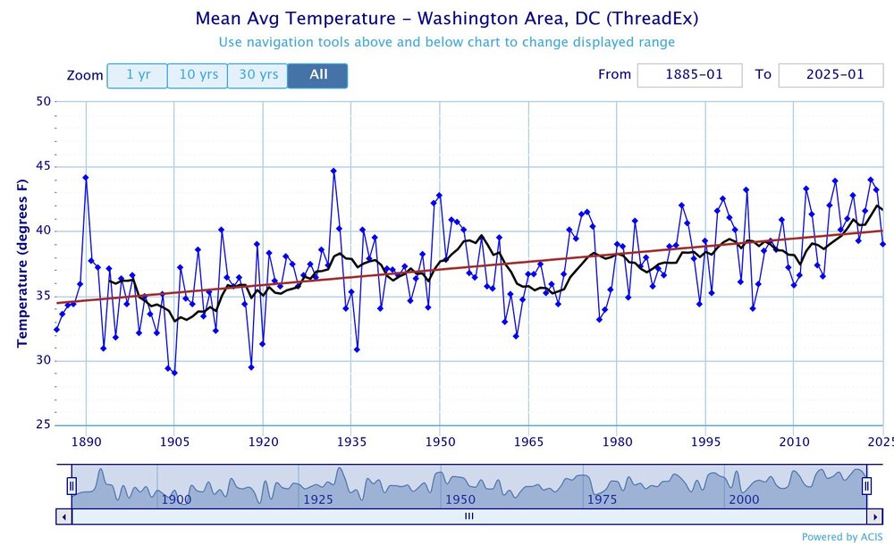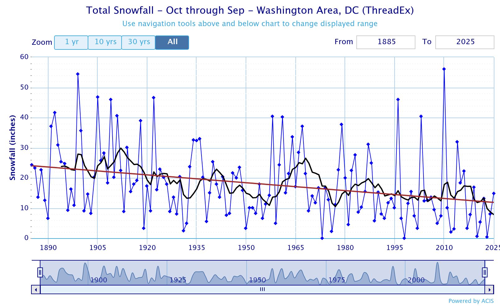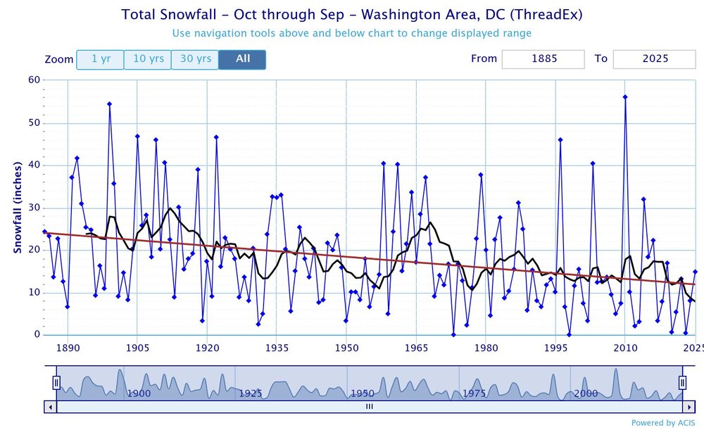 Chris, Who’s to say that the next 9 seasons won’t jump back somewhat given that 2016-7 through 2024-5 was the lightest 9 year avg on record? Consider this: 1948-9 through 1956-7 averaged only 10.9”, which at the time was the lightest 9 season avg on record and was much lower than the 17.6” of the prior 9 season avg: Monthly Total Snowfall for Washington Area, DC (ThreadEx) Mean 0.0 0.0 0.0 T 1.4 1.8 4.4 1.4 1.9 0.0 T T 10.9 1948-1949 0.0 0.0 0.0 0.0 T 4.4 7.4 4.0 T 0.0 0.0 0.0 15.8 1949-1950 0.0 0.0 0.0 0.0 T T 0.3 T 3.1 T 0.0 0.0 3.4 1950-1951 0.0 0.0 0.0 0.0 1.6 3.8 0.8 3.0 1.0 0.0 T 0.0 10.2 1951-1952 0.0 0.0 0.0 0.0 T 4.8 1.6 T 3.8 T 0.0 T 10.2 1952-1953 0.0 0.0 0.0 0.0 1.7 2.0 1.3 0.2 3.1 T 0.0 T 8.3 1953-1954 0.0 0.0 0.0 T 6.7 T 11.3 T T T 0.0 0.0 18.0 1954-1955 0.0 0.0 0.0 T 0.0 0.1 2.3 4.2 T 0.0 0.0 0.0 6.6 1955-1956 0.0 0.0 0.0 0.0 2.3 0.5 4.5 T 4.0 0.0 0.0 0.0 11.3 1956-1957 0.0 0.0 0.0 0.0 T 0.2 10.1 1.6 2.2 0.1 0.0 0.0 14.2 The subsequent 9 seasons jumped way up to 25.0”, one of their heaviest 9 season stretches: Monthly Total Snowfall for Washington Area, DC (ThreadEx) Mean 0.0 0.0 0.0 T 0.2 5.1 6.8 7.9 4.9 0.0 T 0.0 25.0 1957-1958 0.0 0.0 0.0 T 0.3 12.0 0.3 17.2 10.6 0.0 0.0 0.0 40.4 1958-1959 0.0 0.0 0.0 0.0 T 0.9 4.0 T T T 0.0 0.0 4.9 1959-1960 0.0 0.0 0.0 0.0 T T T 7.2 17.1 0.0 0.0 0.0 24.3 1960-1961 0.0 0.0 0.0 0.0 T 8.7 13.6 18.0 T T 0.0 0.0 40.3 1961-1962 0.0 0.0 0.0 0.0 1.3 1.2 2.0 6.5 4.0 0.0 0.0 0.0 15.0 1962-1963 0.0 0.0 0.0 0.0 T 16.2 2.1 2.0 1.1 0.0 T 0.0 21.4 1963-1964 0.0 0.0 0.0 0.0 T 6.4 8.9 11.7 6.2 0.4 0.0 0.0 33.6 1964-1965 0.0 0.0 0.0 0.0 0.2 0.5 9.1 1.9 5.4 0.0 0.0 0.0 17.1 1965-1966 0.0 0.0 0.0 0.0 0.0 0.2 21.3 6.9 T 0.0 0.0 0.0 28.4 ————— Then 1968-9 through 1976-7 attained a new 9 season record low of 10.5”: Monthly Total Snowfall for Washington Area, DC (ThreadEx) Click column heading to sort ascending, click again to sort descending. Mean 0.0 0.0 0.0 T 0.2 2.7 3.0 3.5 1.0 0.1 0.0 0.0 10.5 1968-1969 0.0 0.0 0.0 0.0 T T 0.2 2.2 6.7 0.0 0.0 0.0 9.1 1969-1970 0.0 0.0 0.0 0.0 T 6.8 3.6 3.6 T 0.0 0.0 0.0 14.0 1970-1971 0.0 0.0 0.0 0.0 T 5.2 4.8 0.3 1.4 T 0.0 0.0 11.7 1971-1972 0.0 0.0 0.0 0.0 1.4 0.1 0.3 14.4 T 0.6 0.0 0.0 16.8 1972-1973 0.0 0.0 0.0 T T 0.0 T 0.1 T T 0.0 0.0 0.1 1973-1974 0.0 0.0 0.0 0.0 0.0 11.0 1.5 4.2 T T 0.0 0.0 16.7 1974-1975 0.0 0.0 0.0 T T 0.1 6.6 5.8 0.3 T 0.0 0.0 12.8 1975-1976 0.0 0.0 0.0 0.0 0.0 0.4 0.1 0.9 0.8 0.0 0.0 0.0 2.2 1976-1977 0.0 0.0 0.0 0.0 0.8 0.6 9.7 0.0 0.0 T 0.0 0.0 11.1 That new record low had followed the prior 9 season avg of 26.5”: Monthly Total Snowfall for Washington Area, DC (ThreadEx) Click column heading to sort ascending, click again to sort descending. Mean 0.0 0.0 0.0 0.0 0.9 6.2 6.8 8.4 4.2 0.0 T 0.0 26.5 1959-1960 0.0 0.0 0.0 0.0 T T T 7.2 17.1 0.0 0.0 0.0 24.3 1960-1961 0.0 0.0 0.0 0.0 T 8.7 13.6 18.0 T T 0.0 0.0 40.3 1961-1962 0.0 0.0 0.0 0.0 1.3 1.2 2.0 6.5 4.0 0.0 0.0 0.0 15.0 1962-1963 0.0 0.0 0.0 0.0 T 16.2 2.1 2.0 1.1 0.0 T 0.0 21.4 1963-1964 0.0 0.0 0.0 0.0 T 6.4 8.9 11.7 6.2 0.4 0.0 0.0 33.6 1964-1965 0.0 0.0 0.0 0.0 0.2 0.5 9.1 1.9 5.4 0.0 0.0 0.0 17.1 1965-1966 0.0 0.0 0.0 0.0 0.0 0.2 21.3 6.9 T 0.0 0.0 0.0 28.4 1966-1967 0.0 0.0 0.0 0.0 T 16.1 1.3 19.0 0.7 0.0 0.0 0.0 37.1 1967-1968 0.0 0.0 0.0 0.0 6.9 6.3 2.8 2.4 3.0 0.0 0.0 0.0 21.4 And the new record low 9 season 1968-9 through 1976-7 avg of 10.5” was followed by an 18.8” 9 season mean for 1977-8 through 1985-6: Monthly Total Snowfall for Washington Area, DC (ThreadEx) Click column heading to sort ascending, click again to sort descending. Mean 0.0 0.0 0.0 0.0 0.4 1.1 6.7 8.7 1.8 T 0.0 0.0 18.8 1977-1978 0.0 0.0 0.0 0.0 0.1 0.2 10.3 3.8 8.3 0.0 0.0 0.0 22.7 1978-1979 0.0 0.0 0.0 0.0 3.1 T 4.0 30.6 T 0.0 0.0 0.0 37.7 1979-1980 0.0 0.0 0.0 0.3 0.0 T 8.6 5.1 6.1 0.0 0.0 0.0 20.1 1980-1981 0.0 0.0 0.0 0.0 T 0.3 4.2 T T 0.0 0.0 0.0 4.5 1981-1982 0.0 0.0 0.0 0.0 T 1.7 15.3 5.3 0.2 T 0.0 0.0 22.5 1982-1983 0.0 0.0 0.0 0.0 0.0 6.6 T 21.0 0.0 T 0.0 0.0 27.6 1983-1984 0.0 0.0 0.0 0.0 0.3 T 6.5 T 1.8 T 0.0 0.0 8.6 1984-1985 0.0 0.0 0.0 0.0 T 0.3 10.0 T T T 0.0 0.0 10.3 1985-1986 0.0 0.0 0.0 0.0 0.0 0.7 1.8 12.9 T T 0.0 0.0 15.4 ————— So, in summary: 1939-40 through 1947-8: 17.6” 1948-9 through 1956-7: 10.9” 1957-8 through 1965-6: 25.0” 1959-60 through 1967-8: 26.5” 1968-9 through 1976-7: 10.5” 1977-8 through 1985-6: 18.8” 2007-8 through 2015-6: 15.9” 2016-7 through 2024-5: 7.8” 2025-6 through 2033-4: ??? Maybe 2025-6 through 2033-4 will jump back up a nice amount. It wouldn’t at all surprise me if it were to jump back up to ~12-15”. And then perhaps it would drop back down. Obviously nobody knows. Yes, it’s overall been headed down with the warming, which is intuitive. But I assume we can agree it’s nowhere near a straight plunge.