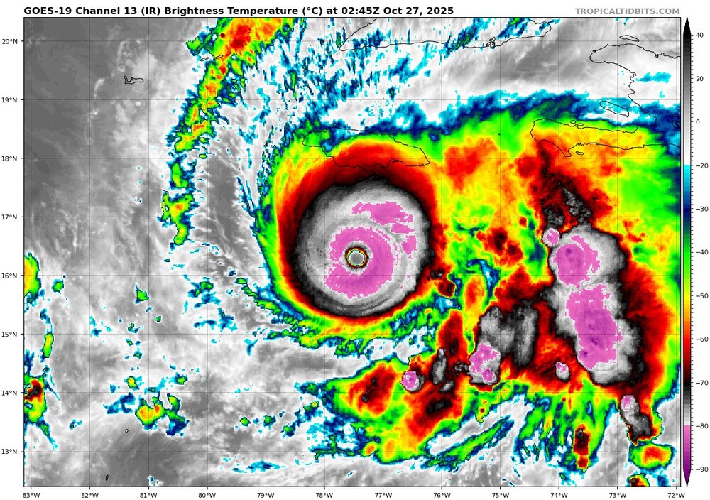 11:00 PM EDT Sun Oct 26 Location: 16.3°N 77.5°W Moving: W at 5 mph Min pressure: 933 mb Max sustained: 145 mph