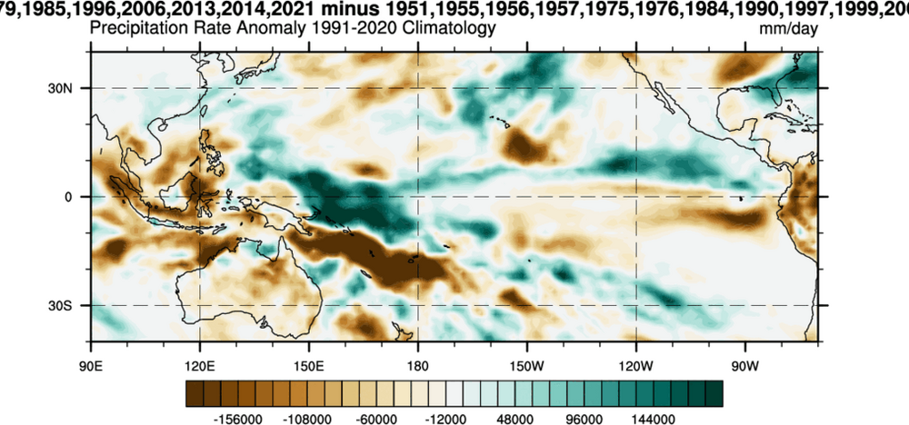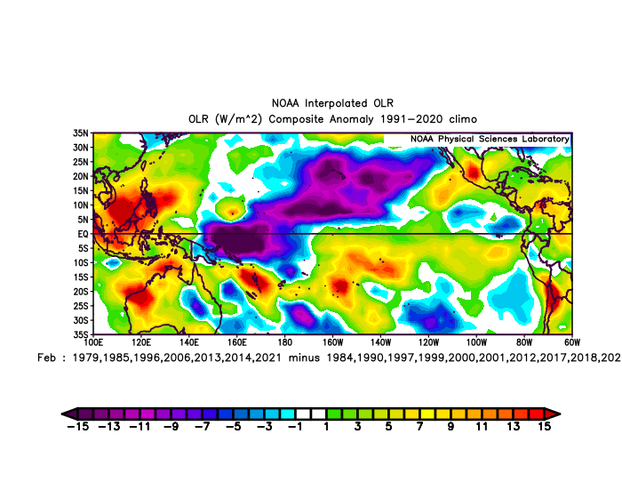 Eric Webb @webberweather 54m One key to this winter having a chance to break the -ENSO stereotype of a warm Feb in the E US is to nudge the IPWP eastward enough to focus convection just west of the Dateline in the Eq. Pacific Tropical Pacific OLR & Precip differences for cold vs warm -ENSO Febs in theE US: