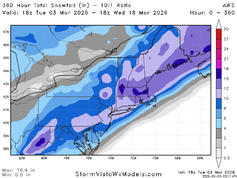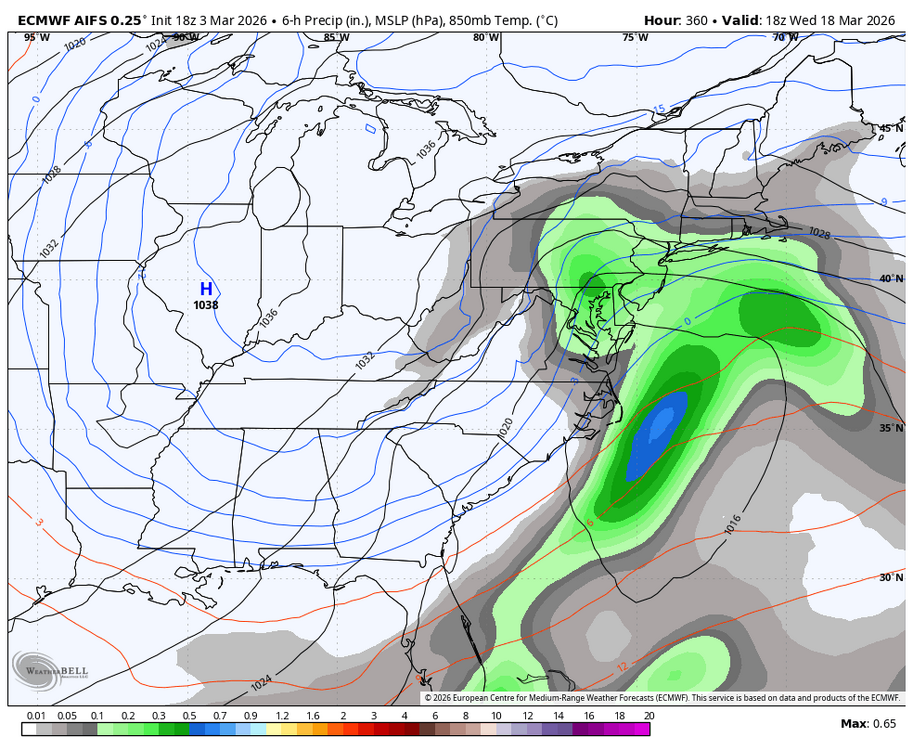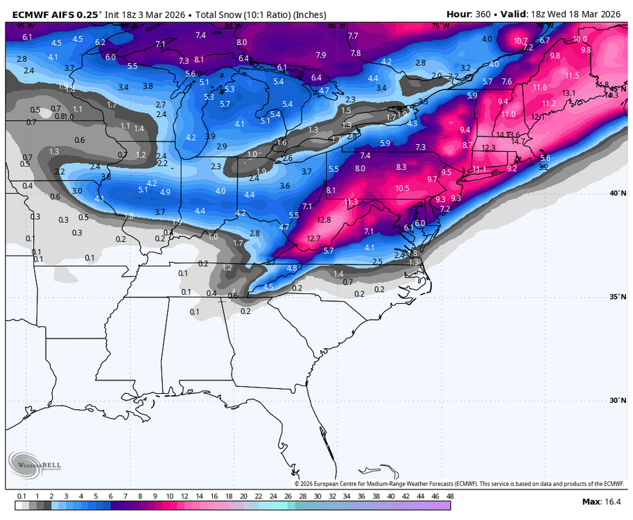 And one again the warmth is shrinking. It will defintely get warm next week but thats because of the disruption to the PV. Euro and Euro AI are cold and wintry because they have the MJO going into 8. 18z gfs just trended colder in the long range. Here is the 18z Euro AI. Yes its 300 plus out but you get the idea. Winter is coming back.( defintely cold )