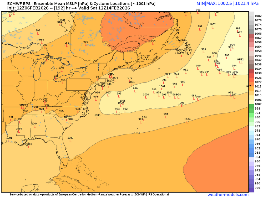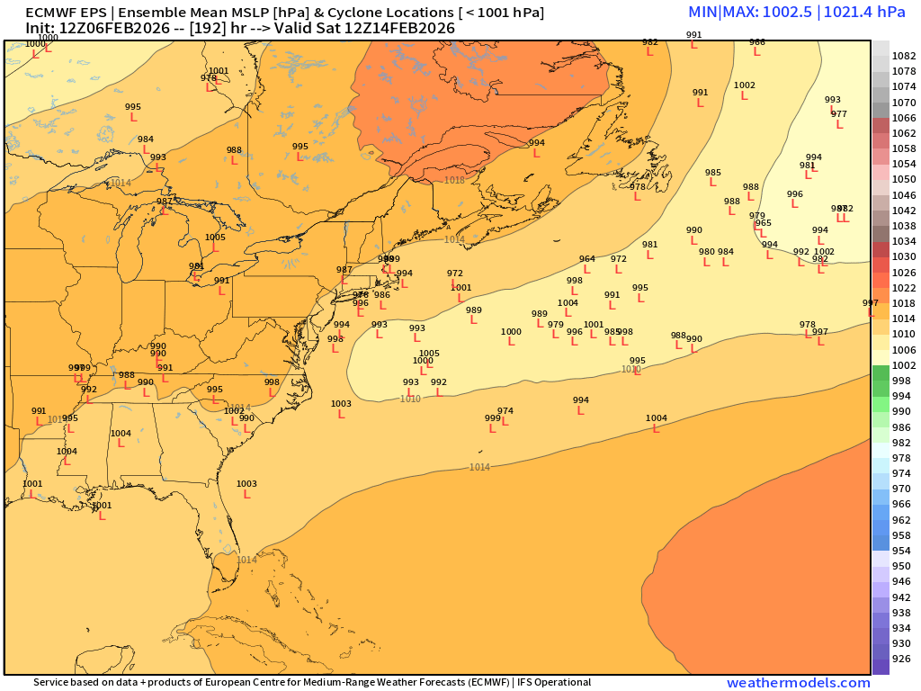 19 / 0 cleat to the west, Cold building down - coldest of the season and at least since 2019, the next 54 hours. Some moderation ext week, especially Tue, to normal and where some areas breach 40 degree mark, firs time since Jan 22. 2/10-2/16 overall near normal to slightly below and dry. The period 2/11 - 2/13 , 2/14 - 2/17 remain periods to watch for systems. Longer range (overnight 2/7 00z) forecasts also focus on the way out there 2/21 period.