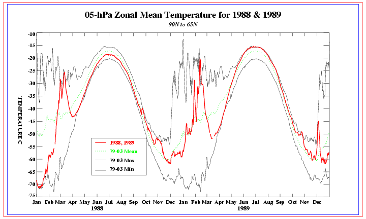 I’m still looking for strat. zonal wind data for 1983 and 1989. In the meantime, I did find the following graph, which is of 65N to 90N zonal mean temperatures at 10 mb in 1988 and 1989. If you’d look on the far right that although there was no major SSW in any of the tables I look at (meaning no reversal of zonal winds at 10 mb), you can see there still was a bit of a stratospheric warming spike centered on ~Dec 1st to near a record high for that date: This is even more evident further up at 5 mb and at 2 mb: 5 mb: 15C spike warming centered near Dec 1st 2 mb: 15C spike warming centered near Dec 1st