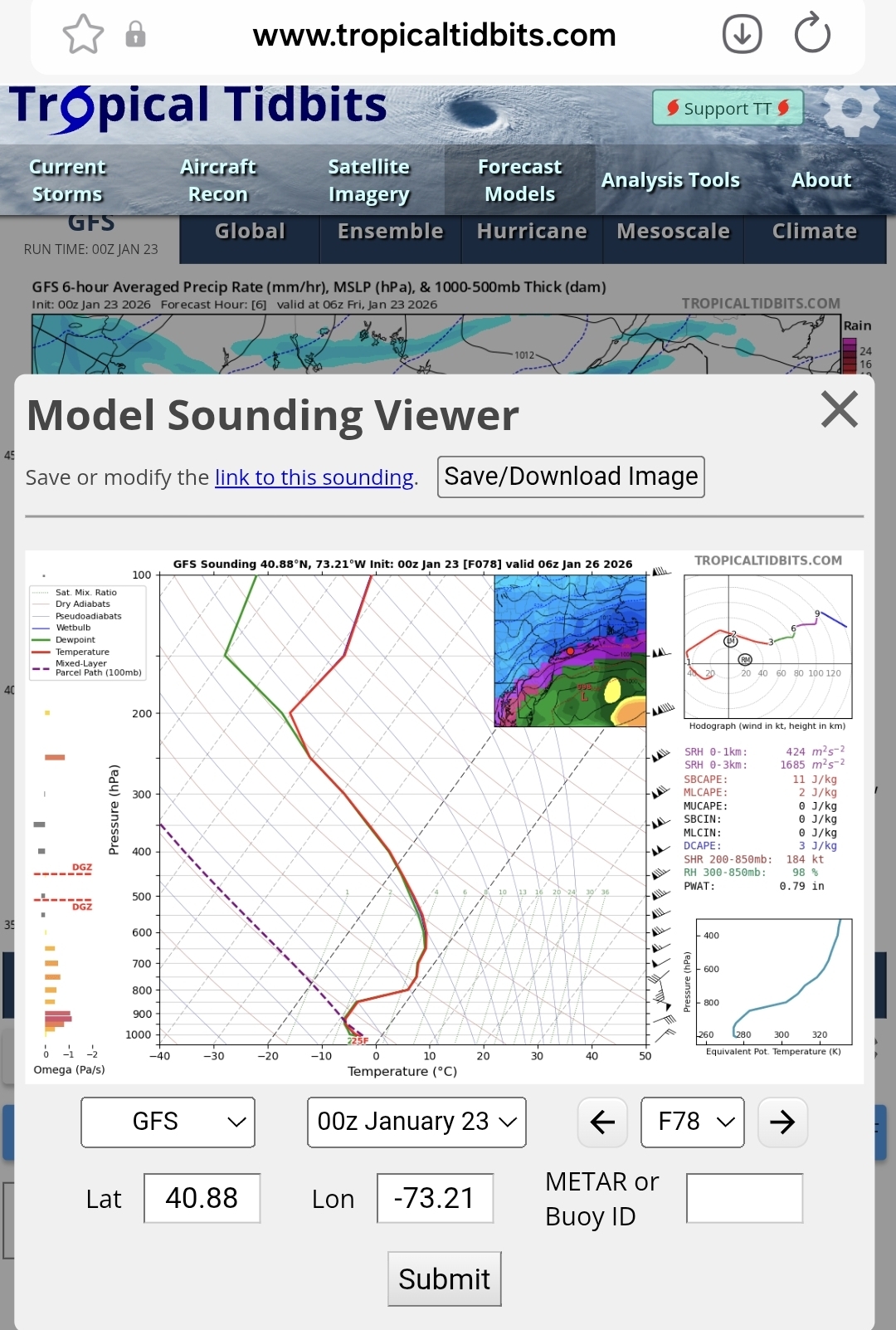 There is still a big front end thump of snow before the mix to sleet, that’s locked in. Getting back to the NAM, Binghamton NWS is expecting a possible turn to sleet all the way up into Northeast PA in their new disco this morning: “Models continue their jog northward for our winter storm Sunday into Monday. No major changes at this time, with still a significant snowstorm expected for the area with a widespread 10"+ with locally higher amounts possibly over 20". The finer scale models will be coming into play over the next 24 hours. It should be noted that the NAM and CMCreg are showing strong SE flow at H850. The NAM is notorious for doing very well forecasting the warm layers aloft and this will be something to monitor as we get closer. This warm layer aloft may not cause mixing per say, but it may significantly change snow ratios Sunday night across NEPA and possibly into the Southern Tier and this would produce lower snow totals in these areas if it comes to fruition. Also, mixing is not noted in our forecast at this time, however, a future change could be warranted if this trend north continues any further and this would also hinder snowfall totals across the southern forecast area some.” -