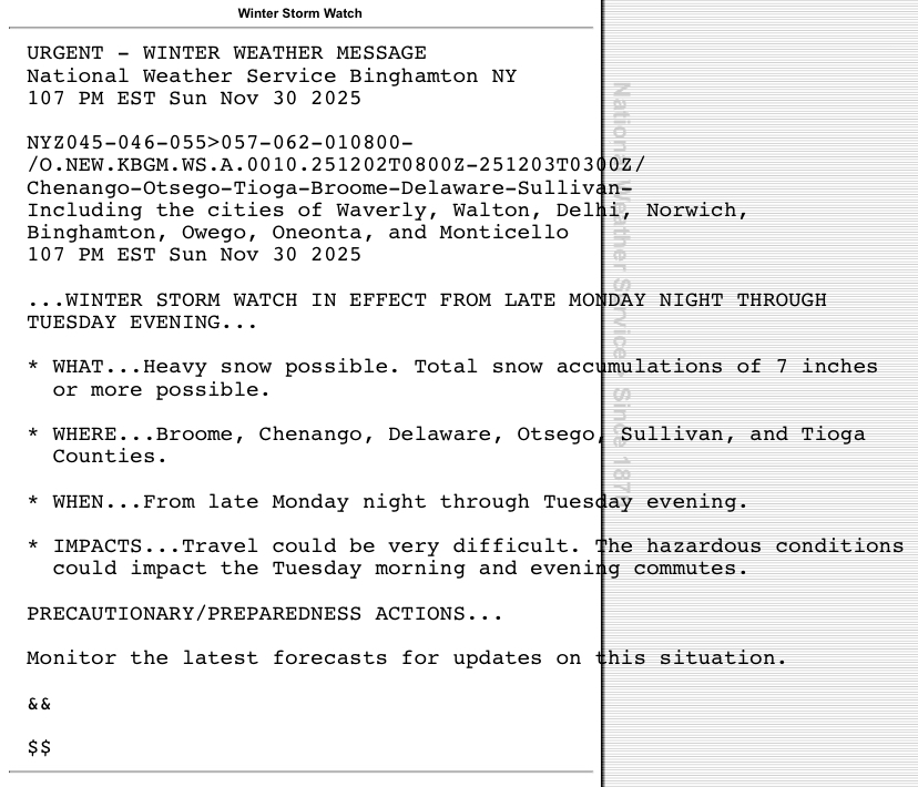 URGENT - WINTER WEATHER MESSAGE National Weather Service New York NY 113 PM EST Sun Nov 30 2025 NYZ067-010700- /O.NEW.KOKX.WS.A.0003.251202T0900Z-251203T0300Z/ Orange- 113 PM EST Sun Nov 30 2025 ...WINTER STORM WATCH IN EFFECT FROM LATE MONDAY NIGHT THROUGH TUESDAY EVENING... * WHAT...Heavy snow possible. Total snow accumulations between 4 and 7 inches possible. * WHERE...Orange County. * WHEN...From late Monday night through Tuesday evening. * IMPACTS...Travel could be very difficult. The hazardous conditions could impact the Tuesday morning and evening commutes. PRECAUTIONARY/PREPAREDNESS ACTIONS... Monitor the latest forecasts for updates on this situation. &&