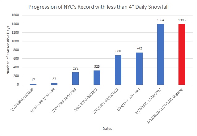 Today will be New York City's (Central Park) 1,395th consecutive day without a 4" (10.2 cm) or above daily snowfall. That will break the record of 1,394 days that was set during February 22, 1929 through December 16, 1932.