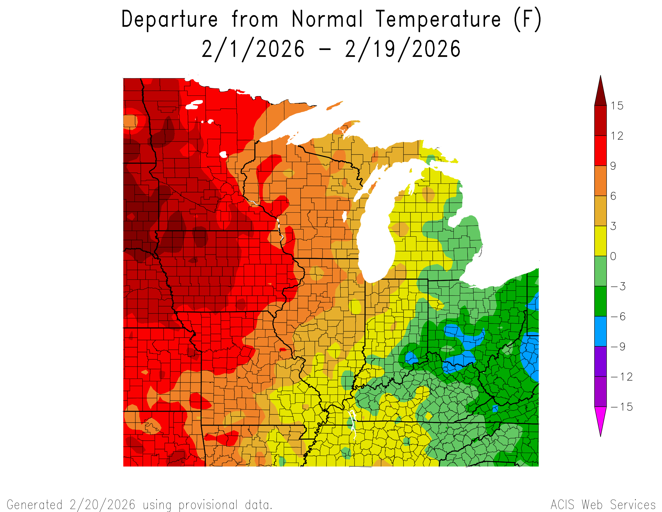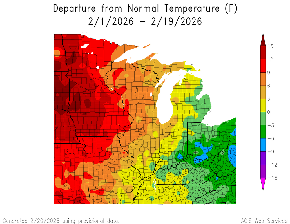 Quite a temp gradient going on this month. Far western part of the sub is near record warm while the far east is below average. Chicago/ORD is running a +6.5 temp departure thus far, not quite record warm, but still very mild.