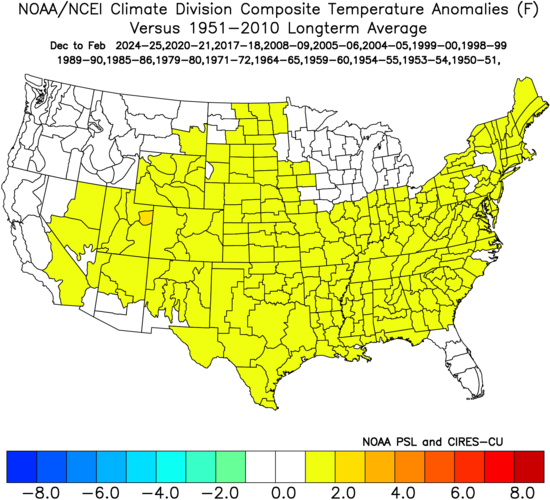 As I showed yesterday, seasons with no H hits on the Conus have shown no notable signal one way or the other for the subsequent winter temperatures. What about the other extreme, winters after seasons with 3+ Conus H hits since 1950? 17 winters: 2024-5, 2020-1, 2017-8, 2008-9, 2005-6, 2004-5, 1999-00, 1998-9, 1989-90, 1985-6, 1979-80, 1971-2, 1964-5, 1959-60, 1954-5, 1953-4, and 1950-1. Here’s their average using climo of 1951-2010: slightly mild but that’s likely a little too warm considering that 3 are post-2010 What about winters after seasons right at the 2 Conus H hit average since 1950? 13 winters: 2022-3, 2021-2, 2019-20, 2018-9, 2016-7, 2012-3, 2003-4, 1996-7, 1995-6, 1986-7, 1966-7, 1960-1, and 1955-6. Here’s their average using climo of 1981-2010: mainly slightly warm to near normal but I’d rather call it near normal overall considering that 1981-2010 climo is slightly too cool being that 6 of the 13 are post-2010 and only 3 are pre-1981 —————— Also, maps for winters following the 29 seasons with exactly one Conus H hit came out right at normal everywhere. ———————— So, to summarize the maps for winters following Conus H seasons with 3+, 2, 1, and 0, the differences are pretty small. Thus there’s little signal one way or the other for winter temperatures based on the # of US conus H hits of the prior season.