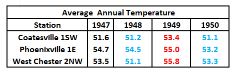 @chubbs Actually Charlie there is total agreement across the 3 stations for those 1948-1949 station moves. Like you said this is easy with the actual data to see the real impact of any station moves. Unlike what you said above we did not see cooling after the station move! The first full year (1949) after the Coatesville move away from what you think was a UHI location - actually saw Coatesville warm by 2.2 degrees and not cool when moving away from the "heat island". As you can see below red is warmer changes and blue is cooler changes in annual temperatures. Perfect agreement as all stations warmed in 1949 following the Coatesville station move and cooled in a similar rate in 1950.