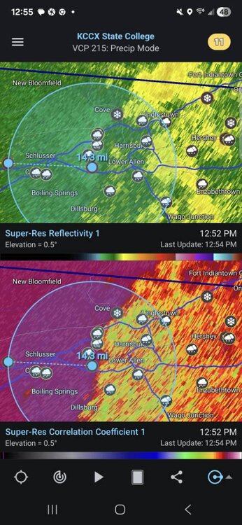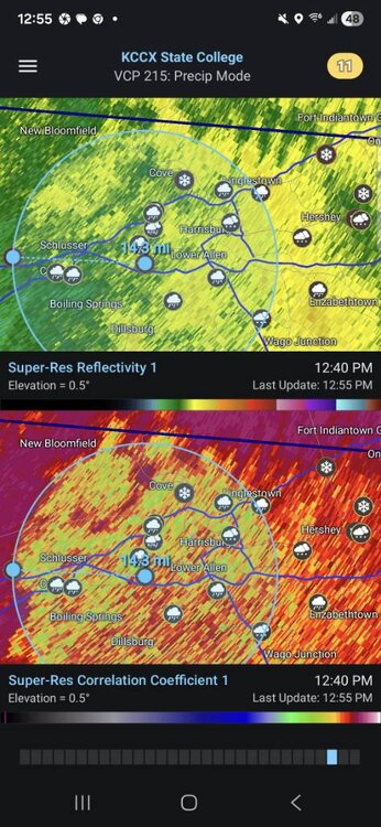 Starting to hear some louder “flakes” hit the windows here just south of Blue Mountain Ski Resort. Some larger flakes mixing in with the pixie dust as well. Think we may end up in a battle zone here. Correlation Coefficient showing the mix line starting to crash south in central PA again. -