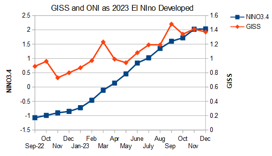 Below are monthly NINO3.4 and GISS stating in October 2022 and running through 2023. I don't see anything here to indicate that el nino wasn't the trigger. NINO3.4 started rising rapidly early in 2023 and GISS followed with a slight lag. The nino doesn't explain monthly spikes in March and September; but, Hungo Tonga doesn't explain the monthly spikes either as the eruption occurred in 2022.