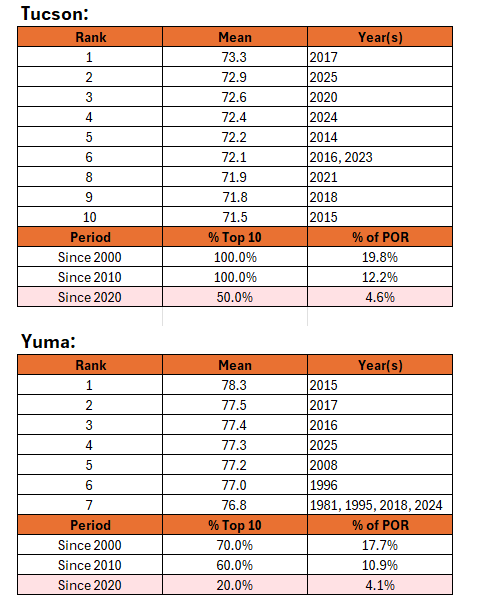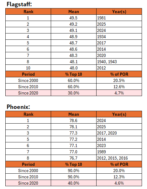 Monthly outcomes are the result of climate change, synoptic patterns and, in the major cities, urban heat island effect. Monthly outcomes are useful for illustrating how synoptic patterns translate in a warming climate. Flagstaff, Phoenix, Tucson, and Yuma have all seen a disproportionate share of their top 10 warmest years since 2000, 2010, and 2020. This skewing of results speaks strongly, but not entirely, of how the region's climate has changed. Similar skewing can be seen in the Arizona statewide data for warmest years and the Southwest regional data for warmest years.