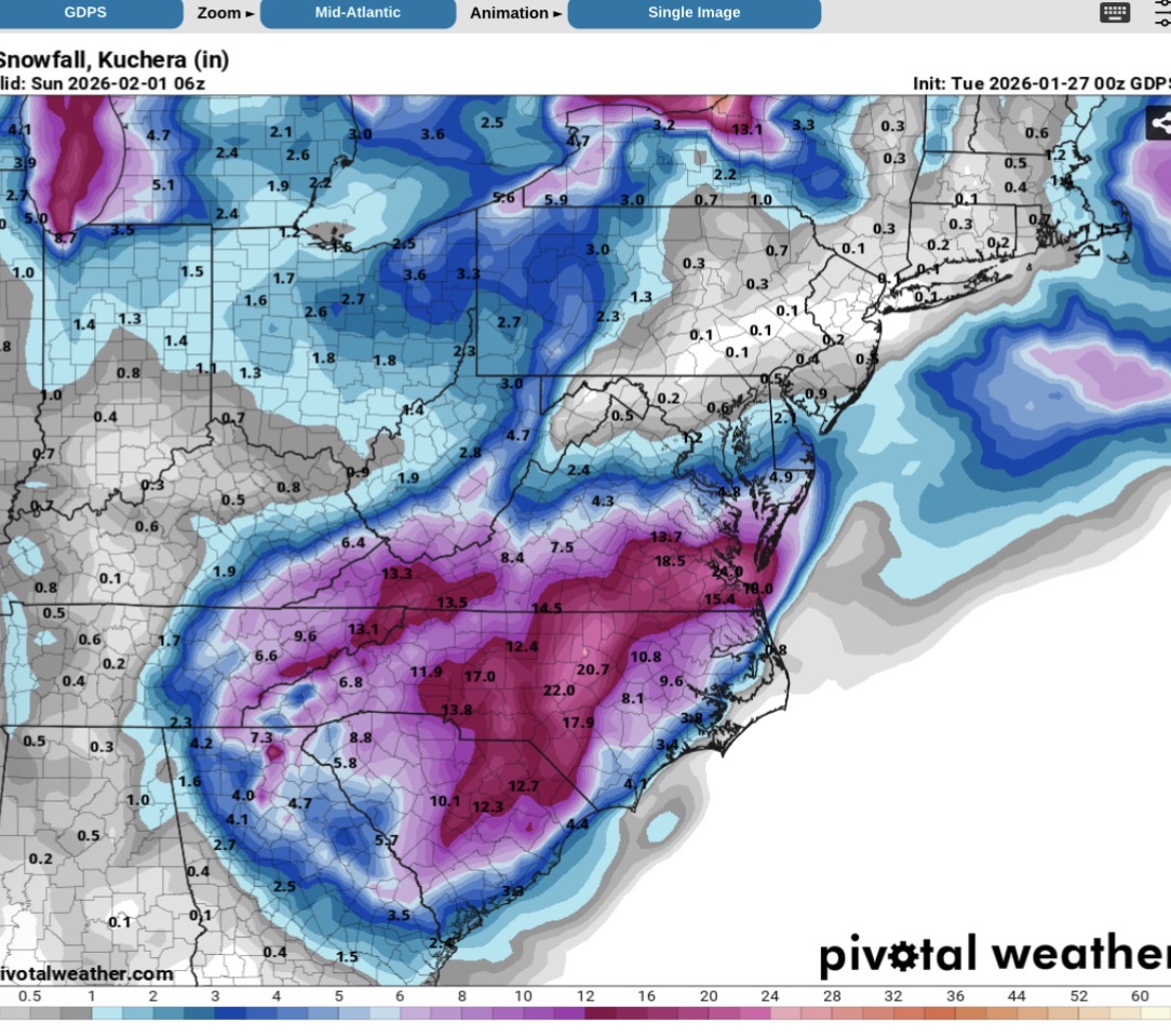 Hour 132 Canadian still has snow for most of North Carolina and northern South Carolina -