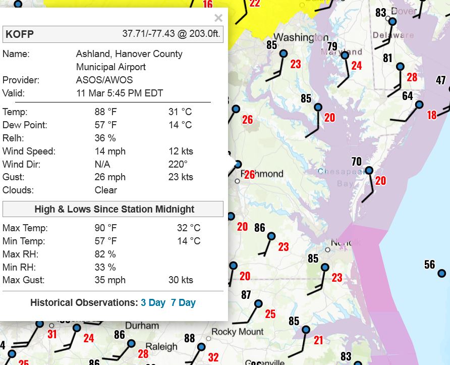I don't have a properly set thermometer; it's sitting on my deck. It got up to 89 today. The official temp was 87 a few miles west at Newport News Intl.