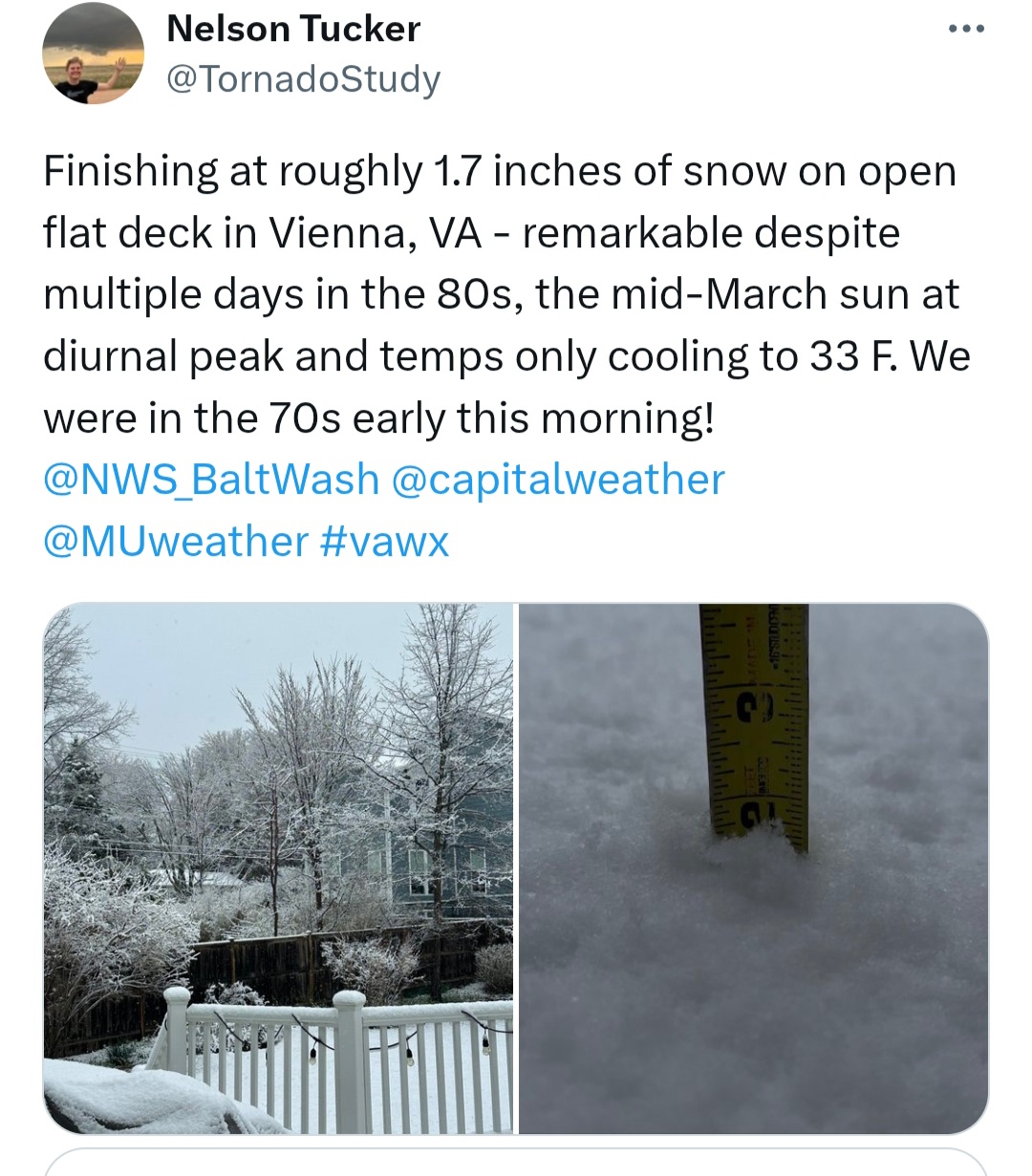 Exactly. This wouldn't be more than a moderate 2-4" snowstorm even with cold temps in Jan, as there's just not enough precip and with the elevated surface temps and higher sun angle this one will be unlikely to put down more than 1" on grassy surfaces anywhere. But temps in the 70s and lower 80s yesterday has nothing to do with whether or not we can have a snowstorm the next day. If it turns cold enough and there's enough snowfall intensity, it'll accumulate easily even at midday.
