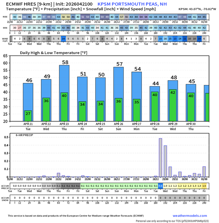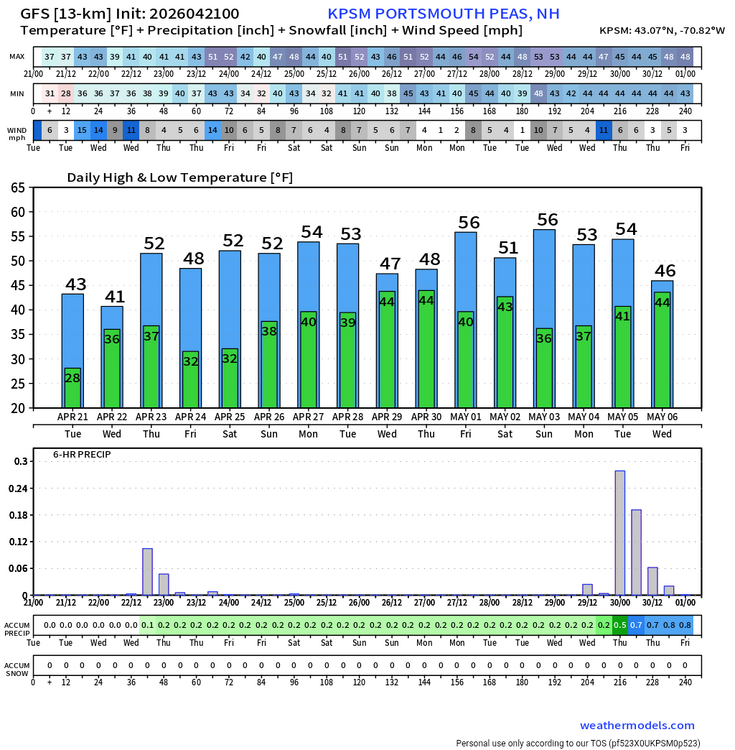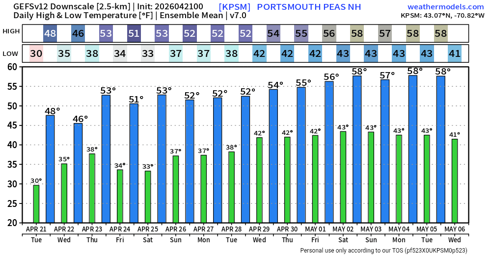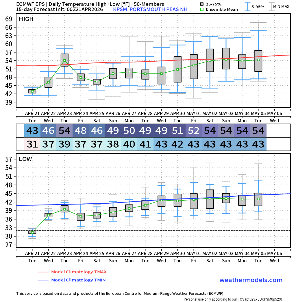 Tomorrow will start off with unseasonably cold temperatures. Lows will fall into the middle or upper 30s in New York City. Areas outside of New York City could experience a late-season freeze. Highs will reach the middle 50s. Wednesday will be somewhat milder. The temperature could approach or reach 70° on Thursday before another cooling trend commences. No significant rainfall appears likely through the foreseeable future. Some showers are possible during the weekend. There remains some risk for a more meaningful rainfall given the lead time involved. The ENSO Region 1+2 anomaly was +1.8°C and the Region 3.4 anomaly was +0.5°C for the week centered around April 15. For the past six weeks, the ENSO Region 1+2 anomaly has averaged +1.43°C and the ENSO Region 3.4 anomaly has averaged +0.15°C. El Niño conditions will likely develop during late spring or early summer. The SOI was -0.07 today. The preliminary Arctic Oscillation (AO) was -0.178 today. Based on sensitivity analysis applied to the latest guidance, there is an implied near 87% probability that New York City will have a warmer than normal April (1991-2020 normal). April will likely finish with a mean temperature near 55.9° (2.2° above normal). Supplemental Information: The projected mean would be 2.9° above the 1981-2010 normal monthly value.