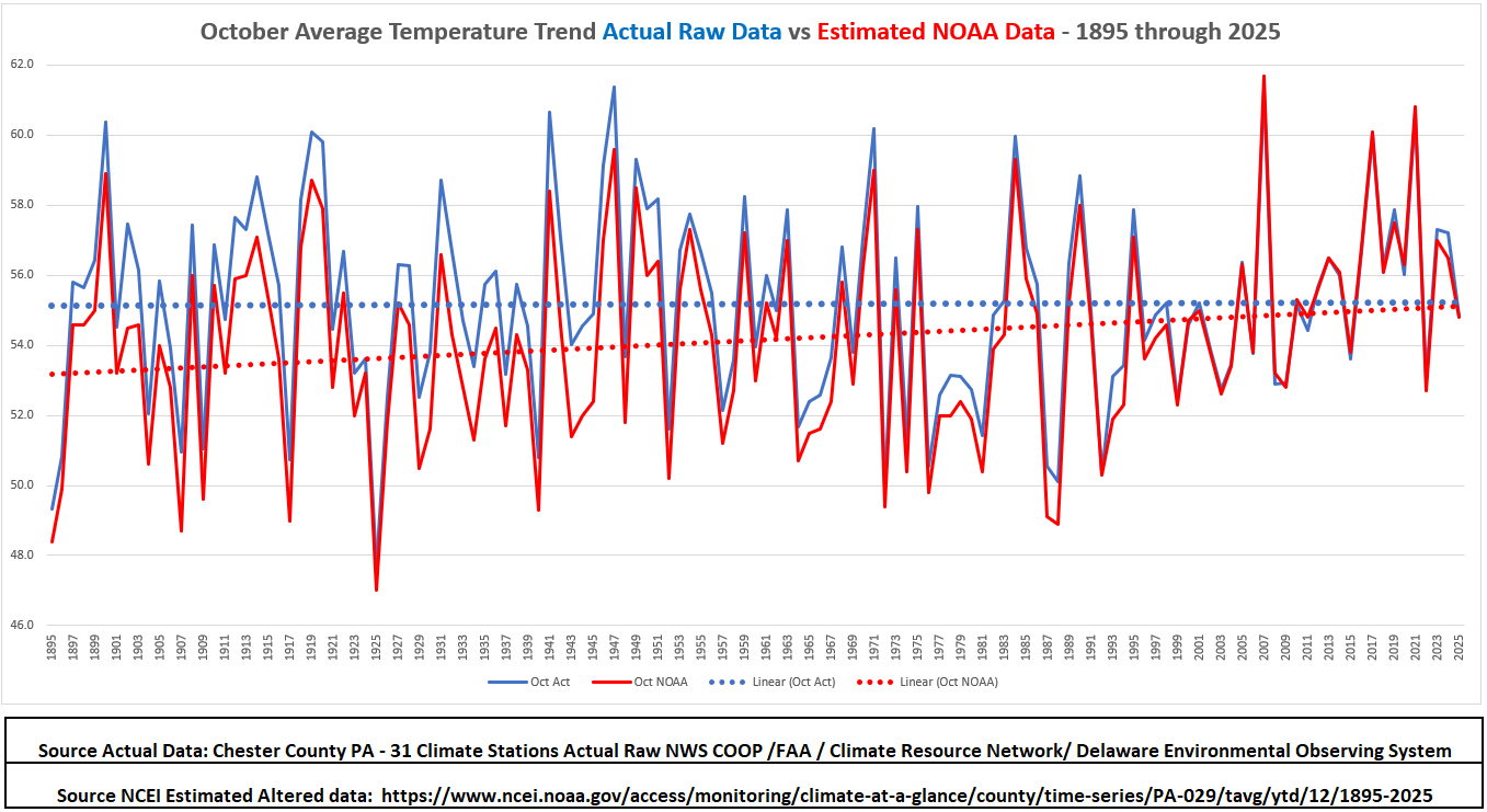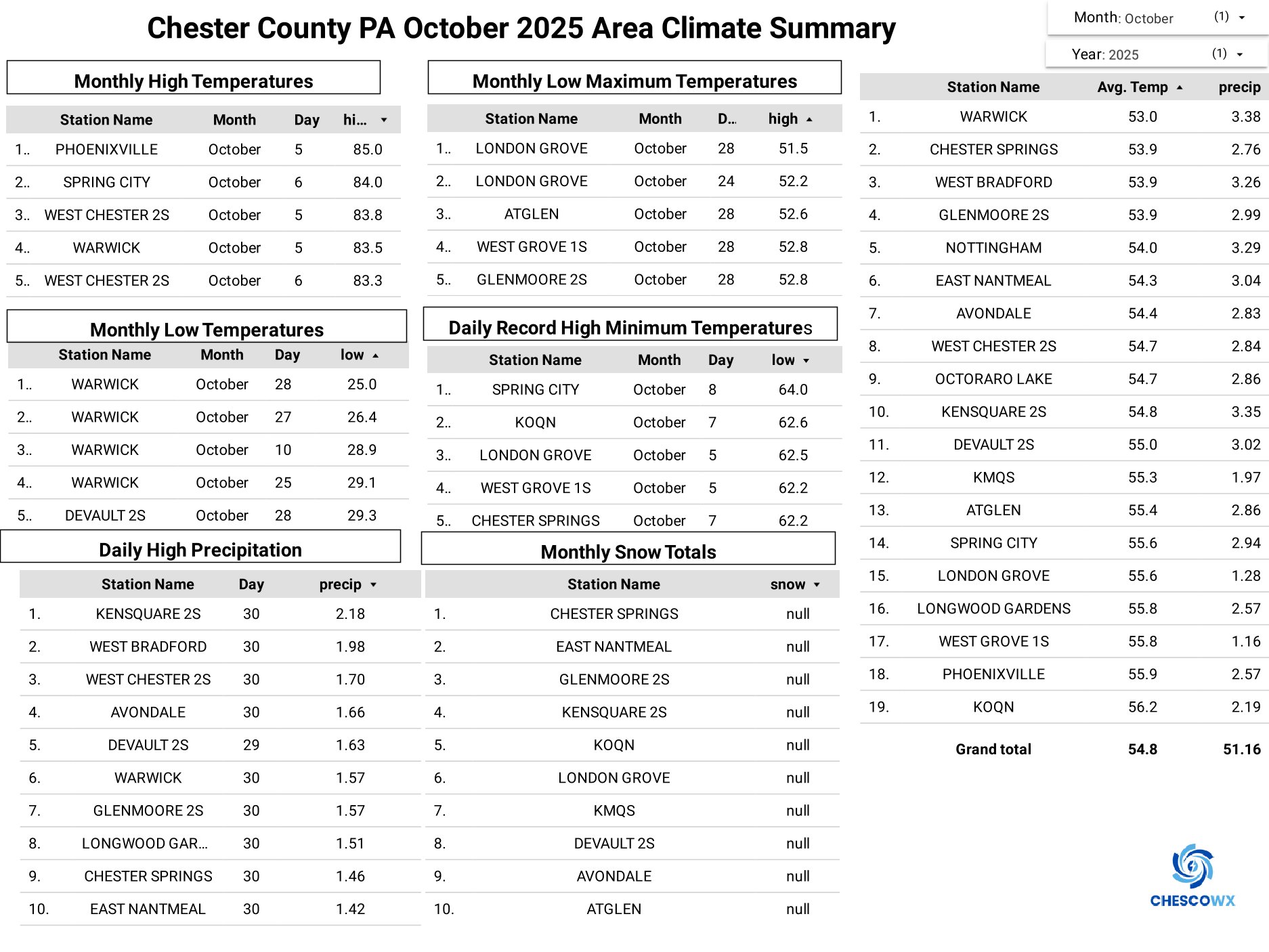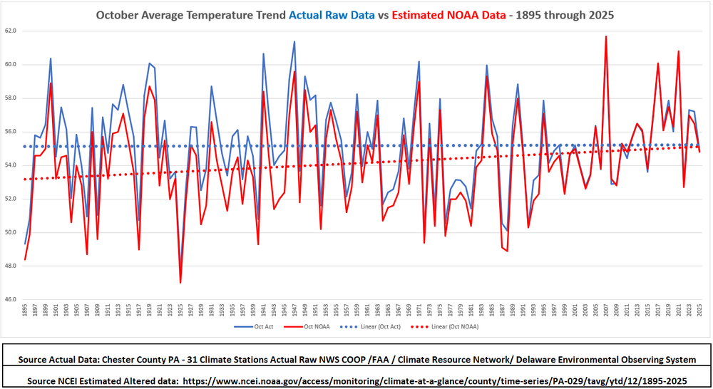 Here in Chester County PA October finished as our 5th below normal temperature month over the 1st 10 months of 2025, It was the 59th coldest October over the last 133 years of county climate records. Precipitation wise it was the 53rd driest October but much wetter than last October which was our driest October on record with many spots not recording any measurable rainfall at all. This October continues our trend of slightly cooling Octobers with climate records back to 1893. Below is the October average temperature trend lines and the overall Climate Summary Detail for October 2025. -