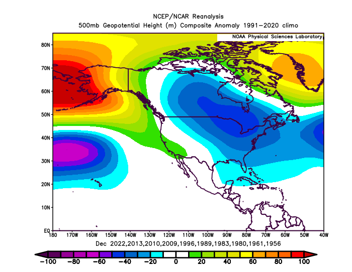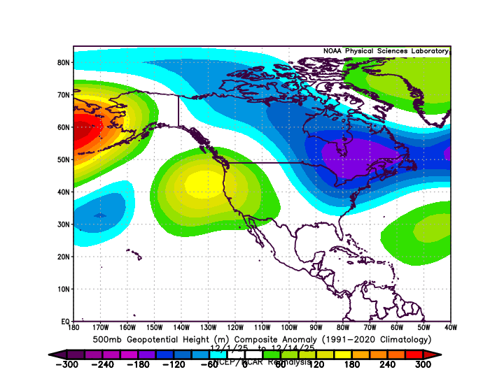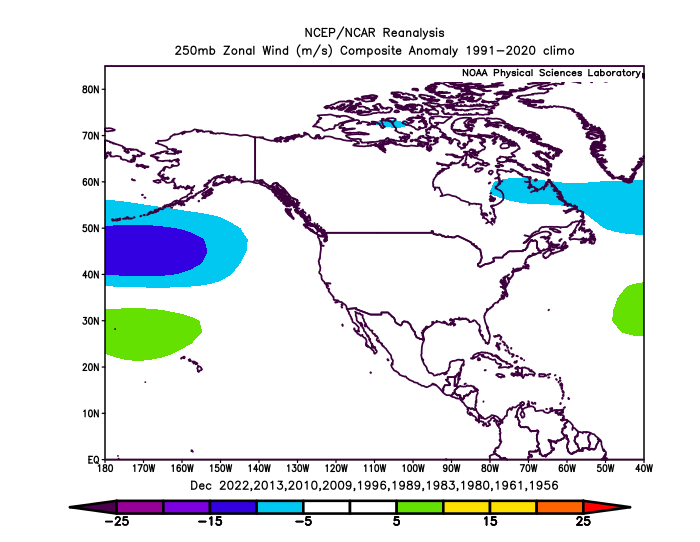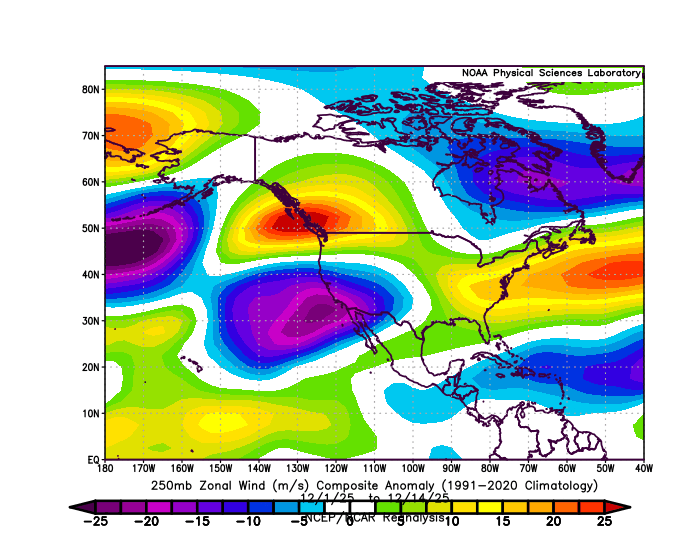 This is going to be one of the strongest -WPO blocks that we have seen for the month of December. But it’s a different configuration of other factors that we have previously seen with December -WPOs in the past. This one has a much more amplified Pacific Jet into the PACNW and BC than we have seen before with the historic flooding in those areas. Plus we have an out of phase +EPO and very strong ridge onto the Western US. Unique December 2025 500 mb and Pacific Jet stream pattern compared to previous very strong -WPO patterns