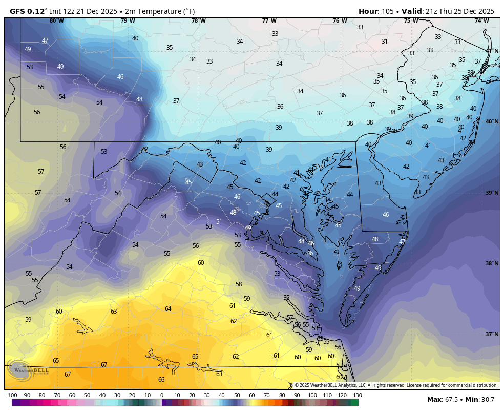 Happy first day of Winter to those that celebrate! We are at about our high temperatures for today with a cold front passing through this morning. Today’s temperatures will drop to freezing by evening. Below normal temperatures tomorrow with near normal high temperatures through Christmas Day. The warmest day of Christmas week looks to be on Boxing Day with temperatures well into the 40's and maybe even 50 in some valley locations. We turn chilly again on Saturday. It looks increasingly likely that snow will arrive by Tuesday morning's rush hour. We should see less than an inch of snow before any change to rain for most of the area with more up toward the Lehigh Valley. Additional rain shower chances for both Christmas and Friday. -