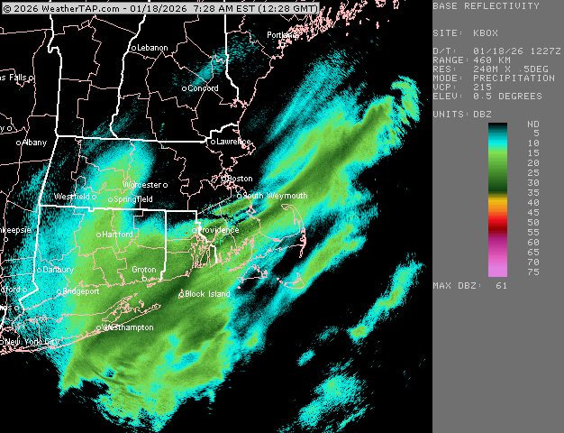 28 / 22 light snow about 1.5 from this latest batch about 1.8 yesterday. More snow later as coastal throws back moisture. Cold the story the next 7 - 10 days with intervals much below normal cold and potential WAA / overrunning snows in the 1/24 - 1/27 range. 1/18: Snow today 1 - 4 overall 1/19 - 1/23 : Overall Cold below normal (Much below normal 1/20 highs 20s / lows singles digis inland) 1/24 - 1/31: Continued cold - Arctic clipper / front - 1/24, WAA/overrunning potential 1/25-1/27. Very cold period 1/25-1/28 could see single digits to the coast / metro 2/1 - beyond : Moderation