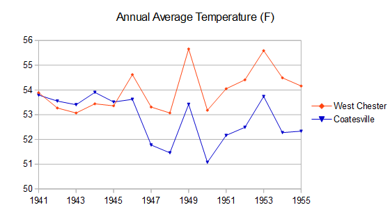 You don't understand how adjustments work. A single station move triggers adjustments for every year before the move. The City of Coatesville was warmer than Doe Run Road in 1946, 1945 , 1944, 1943 and so on. Clearly seen from the chart. That's how we know the cooling was move-related. The effect is persistent. -