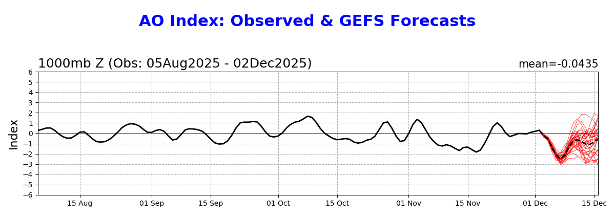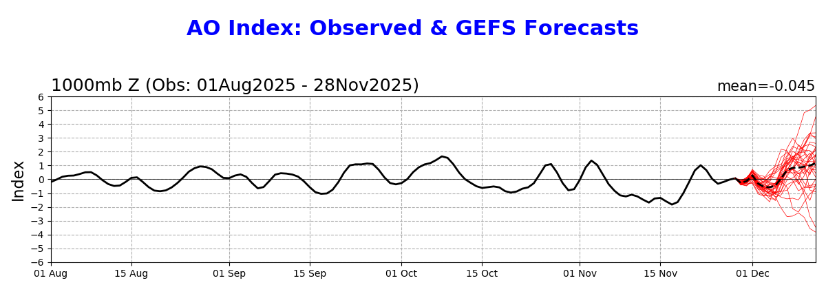 GEFS AO forecasts: Just 4 days ago (11/28 run), it was forecasting the AO to be at +0.7 on Dec 7th (only 9 days out): Today’s run (12/2) has the Dec 7th AO way down to -2.3 or 3.0 lower than the run from a mere 4 days ago: Thus, even the ensemble means when looking out just 8-10 days have recently been missing high latitude blocking. So, for the time being, I’m taking the 11-14 day progs with more of a grain than usual.