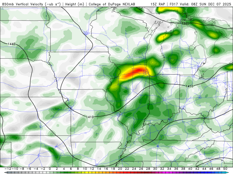 Pretty much all models hinting at a nice corridor of higher UVVs for northern IL tonight between 850mb - 750mb. Not perfectly co-located with the small area of DGZ but not bad at all for a couple hours of 1"+/hr rates perhaps. Not perfectly textbook case but looks like theta-e lines in the cross section are more spaced out and climbing. Perhaps some slantwise convection possible? Not a perfect setup but it does coincide with best LRs (saturated) in the sounding, strong speed shear above veering wind profile, AND weak absolute vorticity. Could really thump right before dawn. -