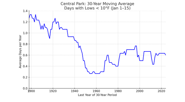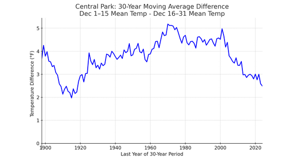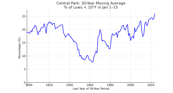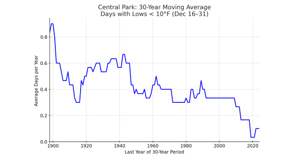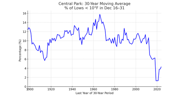 I just went back to the whole climate record. This isn't the first time that it's happened. I suspect that the current narrowing has a climate component in addition to a cyclical/internal variability component. My hypothesis about a climate component's being involved is based on the shrinking deep cold pool resulting in warming winters and a delay in the coldest outbreaks, in general. The result is that the frequency of extreme cold is falling and the distribution of extreme cold is being pushed into the first half of January. Prior to 1990, about 12.1% of NYC's single-digit or colder lows occurred during December 16-31. Since 1990, that figure has fallen to 5.0%. On a 30-year rolling basis, the December 16-31 frequency of such cold is lower than during the earlier period where the temperature difference between December 1-15 and December 16-31 narrowed substantially. The frequency of such cold has declined markedly for the December 16-31 period. Hence, there appears to be a climate component involved this time around with the narrowing of the temperature difference between the first and second halves of December. Distribution of Lows < 10°: Frequency of Lows < 10°: