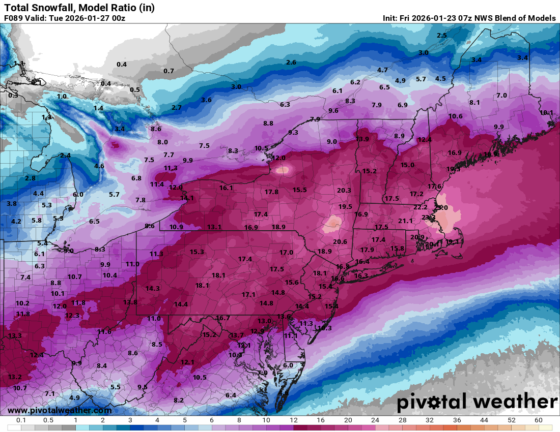 Good AM discussion out of OKX The overall synoptic picture into early next week continues to sharpen. At the surface, arctic high pressure slides east from the Great Lakes into the Northeast this weekend. Meanwhile, low pressure develops and tracks through the South before redeveloping off Cape Hatteras, passing near or just inside the 40N/70W benchmark into Monday. Aiding the potential for snowfall, an arctic air mass settles in ahead of the storm. 925 mb temps look to fall toward -20C or below on Saturday, with surface temperatures progged in the teens during the afternoon, setting up one of the coldest days in several years. This will allow snow to fall everywhere at the onset, which looks to develop rather quickly either very late Saturday night, or more likely Sunday morning around or after daybreak. Periods of heavy snow then appear likely late Sunday morning through the afternoon via the strong frontogenetic and thermal forcing aided by an anticyclonic upper jet to the north. Snowfall rates in this period likely eclipse 1 in/hr at times, perhaps closer to 2 in/hr. Given the cold air mass in place initially, SLRs start out on the higher side (15-18:1) at onset, gradually falling back toward 10:1 or lower along the coast by late afternoon as the mid levels warm. With guidance having adjusted to a closer to the coast surface low, the proximity introduces the possibility of enough warm air intrusion around 800 mb for the snow to mix with or change to sleet Sunday evening. Best chances for this are along the coast, including Long Island and NYC metro. Lower confidence in this occurring going north, with all snow still the most likely solution into the Lower Hudson Valley and Southern Connecticut. Freezing rain or drizzle also cannot be ruled out, though significant icing appears unlikely. As the coastal system deepens and lifts north and east into Monday, the boundary cools once again, and any wintry mix likely tapers as snow showers or flurries into late Monday morning or afternoon. Any additional accumulation is likely light. Forecast snowfall totals have decreased slightly along the coast. This is due to the increased potential for mixing as the warmer air aloft works in. It should be emphasized though the heaviest and steadiest precipitation is expected Sunday morning into early evening, with the bulk of snow accumulation occurring prior to any potential changeover. With QPF progged over an inch, areas that remain all snow should be able to yield double digit snowfall. The question becomes how much warm air is able to work in and force a changeover to sleet, cutting down snow totals. All said, still expecting a widespread 8 to 14 inches across the region, with localized amounts perhaps approaching a foot and a half where best banding sets up and ptype remains all snow. Greatest likelihood for this is across the interior. We remain just over 48 hours from event onset, so opted for no headline changes with this update. It appears likely warnings will be warranted for all areas later today or tonight, dependent on no significant deviations in forecast thought. Continue to monitor the forecast on what is increasingly likely to be a major winter storm with significant disruption to travel and daily life early next week. -