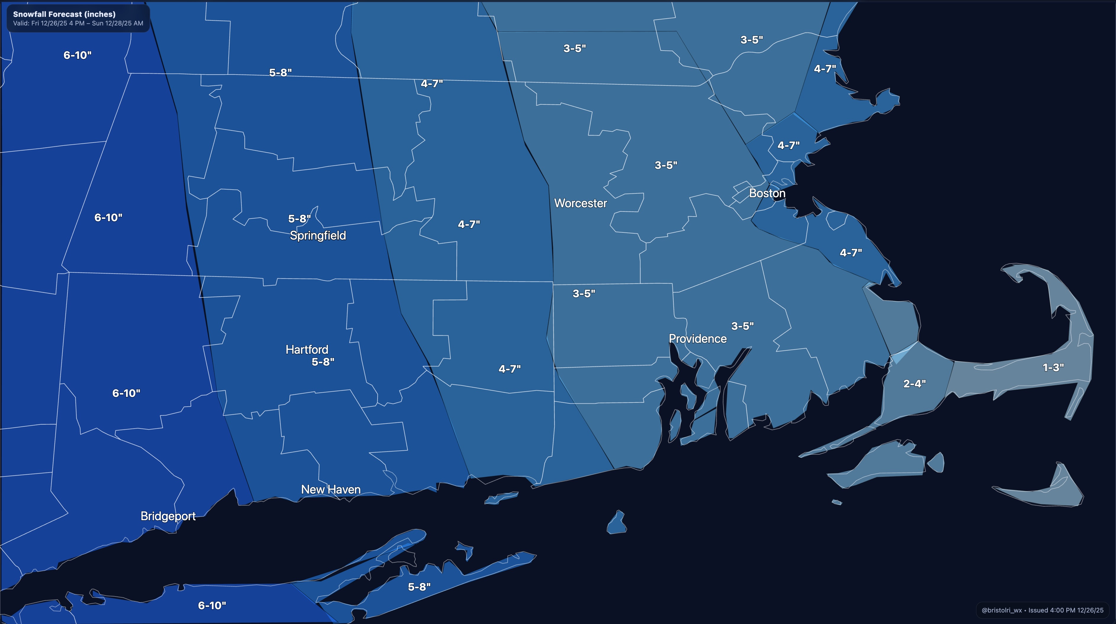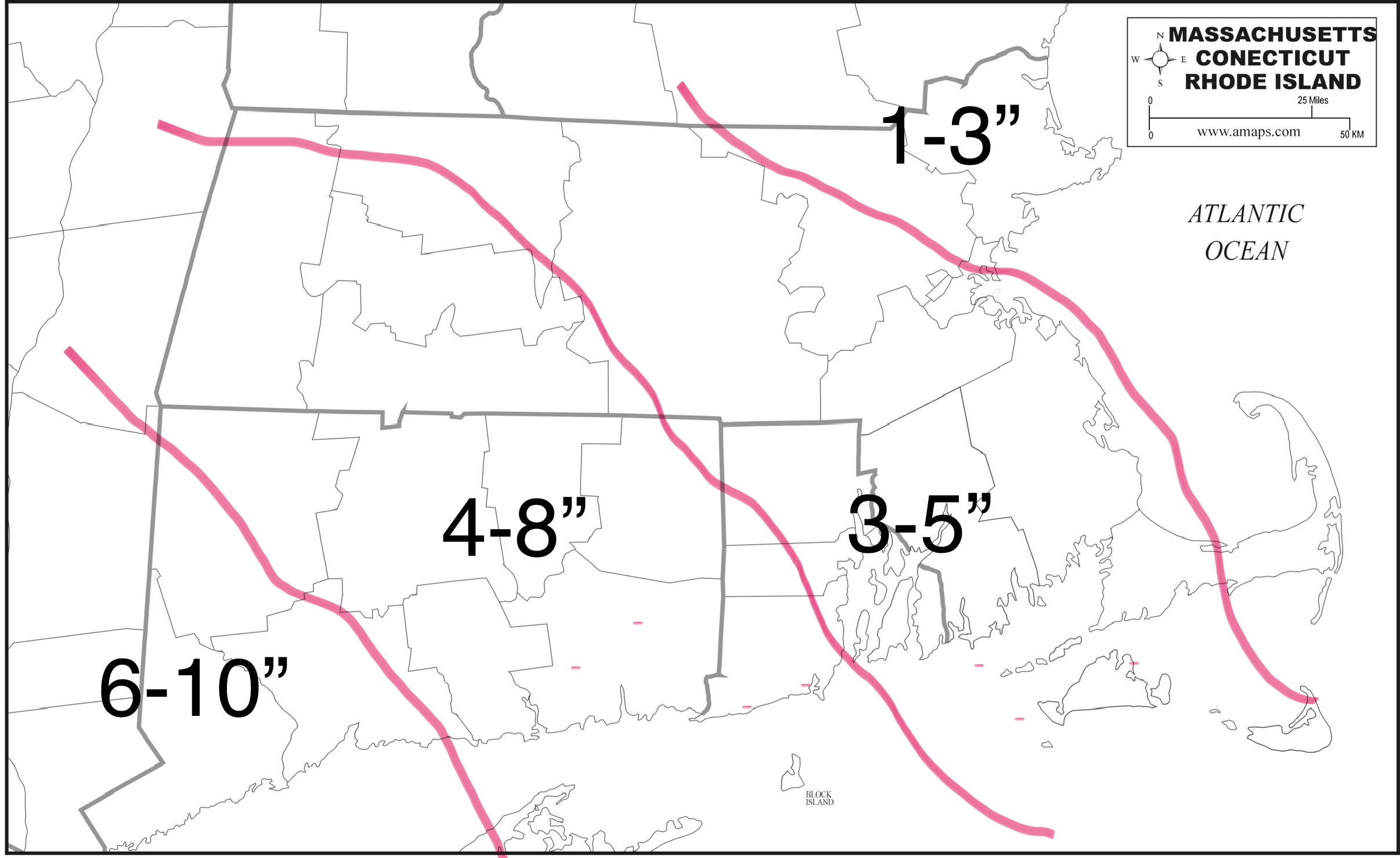 A grade forecast here. Very proud of it, though annoyed I didn't call the 5pm start time in western CT. Glad we didn't take the numbers up yesterday when the models kept ramping up. Wish we put more of New London in our 4-8 zone. -
