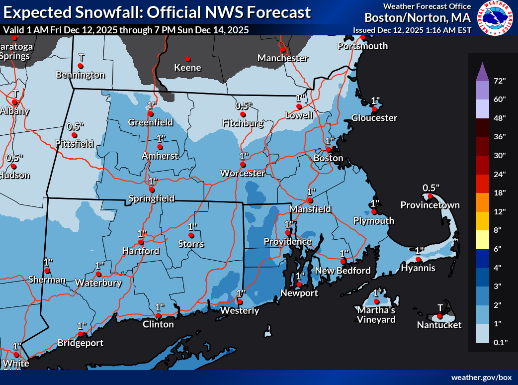 Winter Weather Advisory URGENT - WINTER WEATHER MESSAGE National Weather Service State College PA 1114 PM EST Fri Dec 12 2025 PAZ065-066-131700- /O.EXB.KCTP.WW.Y.0025.251214T0000Z-251214T1800Z/ York-Lancaster- Including the cities of Lancaster and York 1114 PM EST Fri Dec 12 2025 ...WINTER WEATHER ADVISORY IN EFFECT FROM 7 PM SATURDAY TO 1 PM EST SUNDAY... * WHAT...Snow expected. Total snow accumulations between 2 and 3 inches. Locally higher spot amounts are possible. * WHERE...Lancaster and York Counties. * WHEN...From 7 PM Saturday to 1 PM EST Sunday. * IMPACTS...Plan on slippery road conditions. The hazardous conditions could impact the Monday morning commute. -