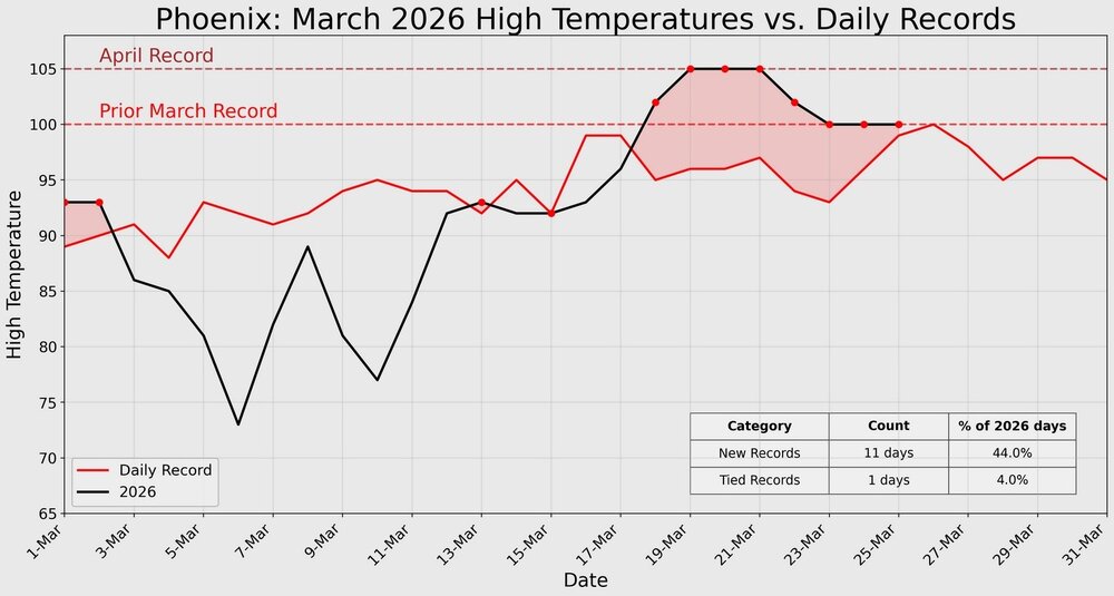 Hey Don, Phoenix had a high of 100 today, the 8th day in a row of 100+! Before 2026, there had been only one March day of 100+ and that was right at 100 on March 26th! Holy cow! -